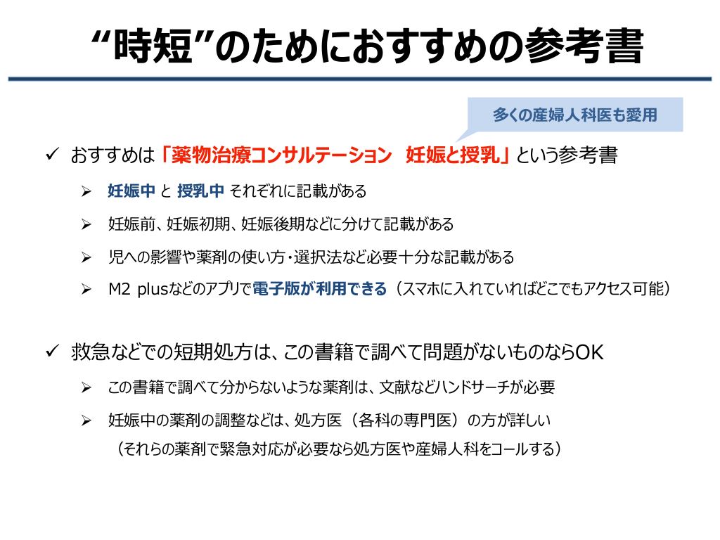 #6. “時短”のためにおすすめの参考書 多くの産婦⼈科医も愛⽤ ü おすすめは 「薬物治療コンサルテーション 妊娠と授乳」 という参考書 Ø 妊娠中 と 授乳中 それぞれに記載がある Ø 妊娠前、妊娠初期、妊娠後期などに分けて記載がある Ø 児への影響や薬剤の使い⽅・選択法など必要⼗分な記載がある Ø M2 plusなどのアプリで電⼦版が利⽤できる(スマホに⼊れていればどこでもアクセス可能) ü 救急などでの短期処⽅は、この書籍で調べて問題がないものならOK Ø この書籍で調べて分からないような薬剤は、⽂献などハンドサーチが必要 Ø 妊娠中の薬剤の調整などは、処⽅医(各科の専⾨医)の⽅が詳しい (それらの薬剤で緊急対応が必要なら処⽅医や産婦⼈科をコールする)