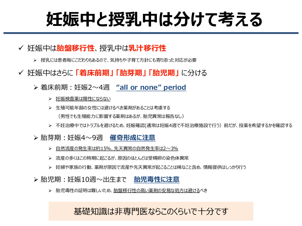 #8. 妊娠中と授乳中は分けて考える ü 妊娠中は胎盤移⾏性、授乳中は乳汁移⾏性 Ø 授乳には患者毎にこだわりもあるので、気持ちや⼦育て⽅針にも寄り添った対応が必要 ü 妊娠中はさらに 「着床前期」 「胎芽期」 「胎児期」 に分ける Ø 着床前期︓妊娠2〜4週 “all or none” period Ø 妊娠検査薬は陽性にならない Ø ⽣殖可能年齢の⼥性には避けるべき薬剤があることは考慮する (男性でも⽣殖能⼒に影響する薬剤はあるが、胎児異常は報告なし) Ø 不妊治療中ではトラブルを避けるため、妊娠確認(通常は妊娠4週で不妊治療施設で⾏う)前だが、投薬を希望するかを確認する Ø 胎芽期︓妊娠4〜9週 催奇形成に注意 Ø ⾃然流産の発⽣率は約15%、先天異常の⾃然発⽣率は2〜3% Ø 流産の多くはこの時期に起こるが、原因のほとんどは受精卵の染⾊体異常 Ø 妊婦や家族の⾏動、薬剤が原因で流産や先天異常が起こることは稀なこと含め、情報提供はしっかり⾏う Ø 胎児期︓妊娠10週〜出⽣まで 胎児毒性に注意 Ø 胎児毒性の証明は難しいため、胎盤移⾏性の⾼い薬剤の安易な処⽅は避けるべき 基礎知識は⾮専⾨医ならこのくらいで⼗分です