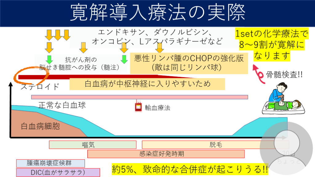 オンコビン、Lアスパラギナーゼなど ステロイド 正常な白血球 白血病細胞 嘔気 脱毛 感染症好発時期 腫瘍崩壊症候群 DIC(血がサラサラ) 骨髄検査!! 輸血療法 1setの化学療法で