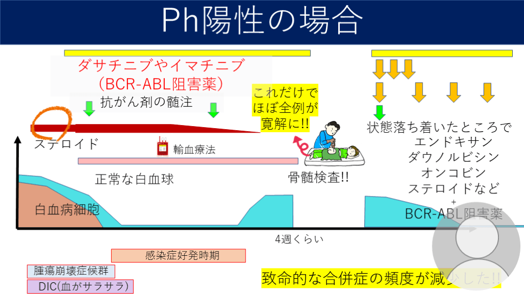 寛解に!! 4週くらい 致命的な合併症の頻度が減少した!! 抗がん剤の髄注 ダサチニブやイマチニブ(BCR-ABL阻害薬) 状態落ち着いたところで エンドキサン