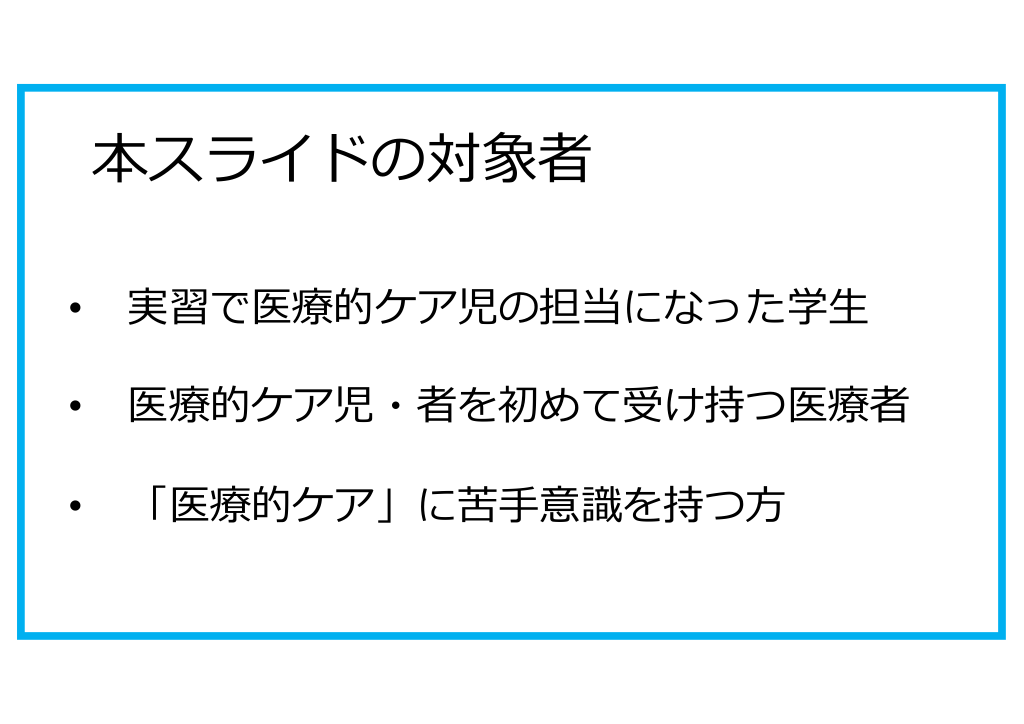 #2. 本スライドの対象者 • 実習で医療的ケア児の担当になった学⽣ • 医療的ケア児・者を初めて受け持つ医療者 • 「医療的ケア」に苦⼿意識を持つ⽅