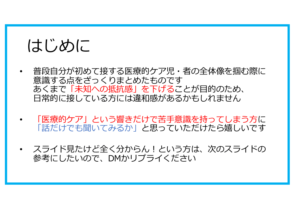 #3. はじめに • 普段⾃分が初めて接する医療的ケア児・者の全体像を掴む際に 意識する点をざっくりまとめたものです あくまで「未知への抵抗感」を下げることが⽬的のため、 ⽇常的に接している⽅には違和感があるかもしれません • 「医療的ケア」という響きだけで苦⼿意識を持ってしまう⽅に 「話だけでも聞いてみるか」と思っていただけたら嬉しいです • スライド⾒たけど全く分からん︕という⽅は、次のスライドの 参考にしたいので、DMかリプライください
