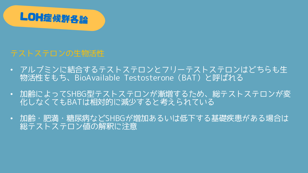 テストステロンの生物活性 • アルブミンに結合するテストステロンとフリーテストステロンはどちらも生 物活性をもち、BioAvailable Testosterone(BAT)と呼ばれる • 加齢によってSHBG型テストステロンが漸増するため、総テストステロンが変 化しなくてもBATは相対的に減少すると考えられている • 加齢・肥満・糖尿病などSHBGが増加あるいは低下する基礎疾患がある場合は 総テストステロン値の解釈に注意 男性更年期の診療と評価方法 #11.