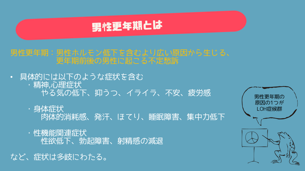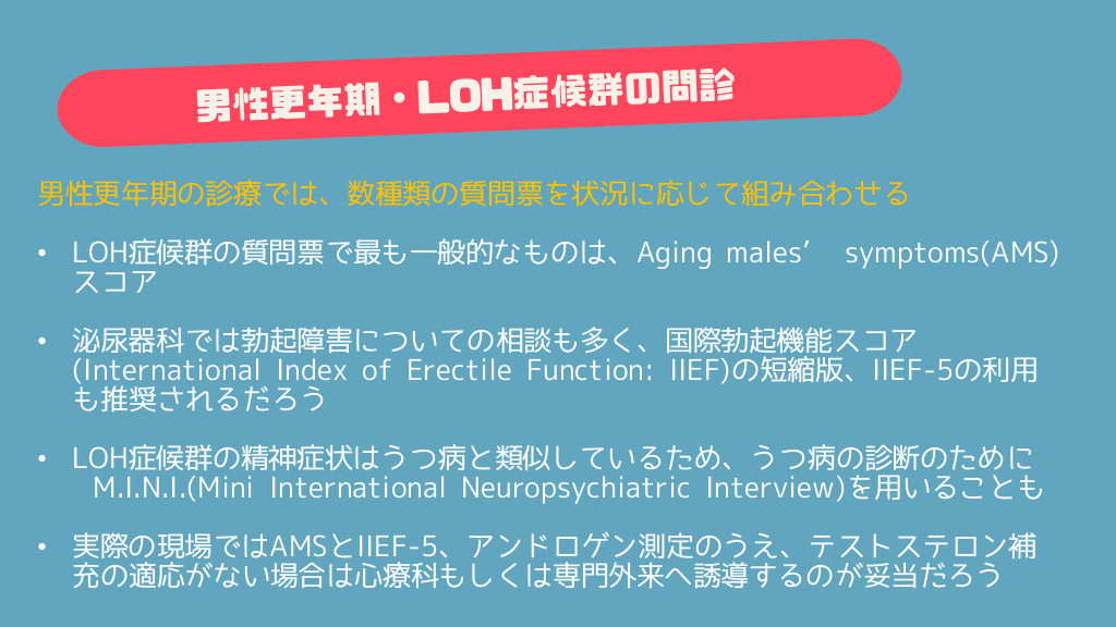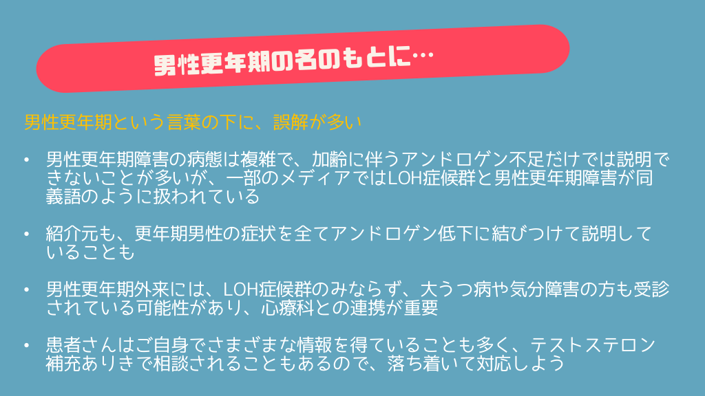 男性更年期は様々な原因、症状が複雑に関係し ており分かっていないことも多い 問診や身体診察など行うべき検査も多く、テ ストステロン補充に関しては禁忌も多いため 慎重に判断する 相談できる医師がいる場合は複数人で治療方針 を検討し、一人で抱え込まず専門外来(メン ズヘルス外来)へ誘導するのも一手だろう アンチエイジングを目的に 必死にサプリを飲む泌尿器科医 参考文献とガイドライン #29. 【参照】 男性の性腺機能低下症ガイドライン作成委員会編:日本内分泌学会、 日本メンズヘルス医学会 男性の性腺機能低下症ガイドライン2022 https://www.mens-health.jp/wp-content/uploads/2021/10/c95fe605f4e4127722b302a0213fc301.pdf 日本泌尿器科学会/日本Men’s Health医学会「LOH 症候群診療ガイドライン」検討ワーキング委員会, 加齢男性性腺機能低下症候群(LOH症候群)診療の手引き, 2007 https://www.urol.or.jp/lib/files/other/guideline/30_loh_syndrome.pdf 岩本晃明, 日本人成人男子の総テストステロン,遊離テストステロンの基準値の設定, 日泌会誌 2004;95:751-760 Muller RL, et al. Serum testosterone and dihydrotestosterone and prostate cancer risk in the placebo arm of the reduction by dutasteride of prostate cancer events trial. Eur Urol. 2012;62:757-764 Feneley MR et al. Is testosterone treatment good for the prostate? Study of safety during long-term treatment. J Sex Med. 9:2138-49. 2012. Boyle P, et al. Endogenous and exogenous testosterone and the risk of prostate cancer and increased prostate-specific antigen (PSA) level: a meta-analysis. BJU Int 2016;118:731–41., Calof OM, et al. Adverse events associated with testosterone replacement in middle-aged and older men: