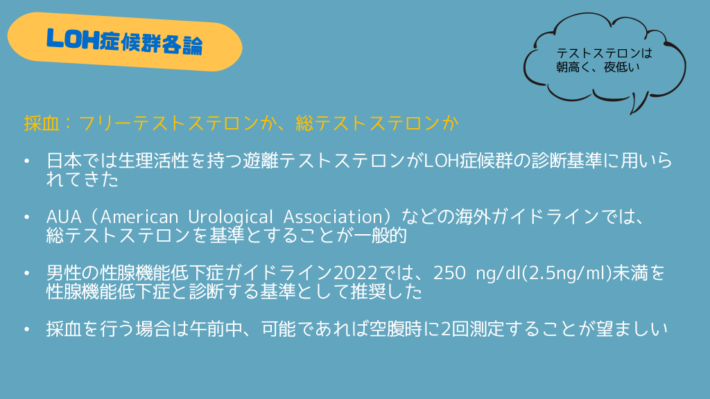 テストステロンは 朝高く、夜低い 採血:フリーテストステロンか、総テストステロンか • 日本では生理活性を持つ遊離テストステロンがLOH症候群の診断基準に用いら れてきた • AUA(American Urological Association)などの海外ガイドラインでは、 総テストステロンを基準とすることが一般的 • 男性の性腺機能低下症ガイドライン2022では、250 ng/dl(2.5ng/ml)未満を 性腺機能低下症と診断する基準として推奨した • 採血を行う場合は午前中、可能であれば空腹時に2回測定することが望ましい テストステロン補充療法の実施と注意点 #15.