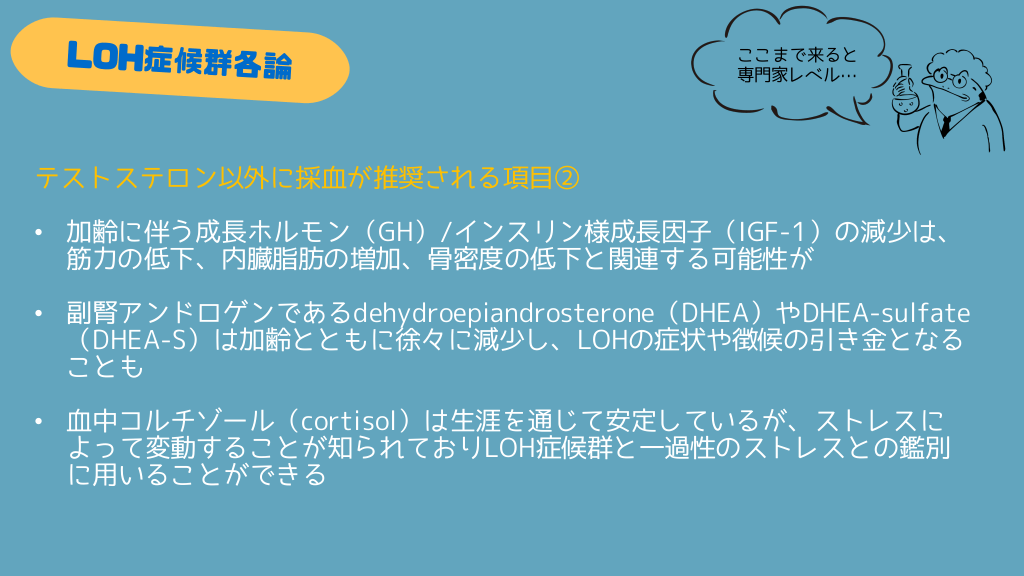 ここまで来ると 専門家レベル… テストステロン以外に採血が推奨される項目② • 加齢に伴う成長ホルモン(GH)/インスリン様成長因子(IGF-1)の減少は、 筋力の低下、内臓脂肪の増加、骨密度の低下と関連する可能性が • 副腎アンドロゲンであるdehydroepiandrosterone(DHEA)やDHEA-sulfate (DHEA-S)は加齢とともに徐々に減少し、LOHの症状や徴候の引き金となる ことも • 血中コルチゾール(cortisol)は生涯を通じて安定しているが、ストレスに よって変動することが知られておりLOH症候群と一過性のストレスとの鑑別 に用いることができる #17.
