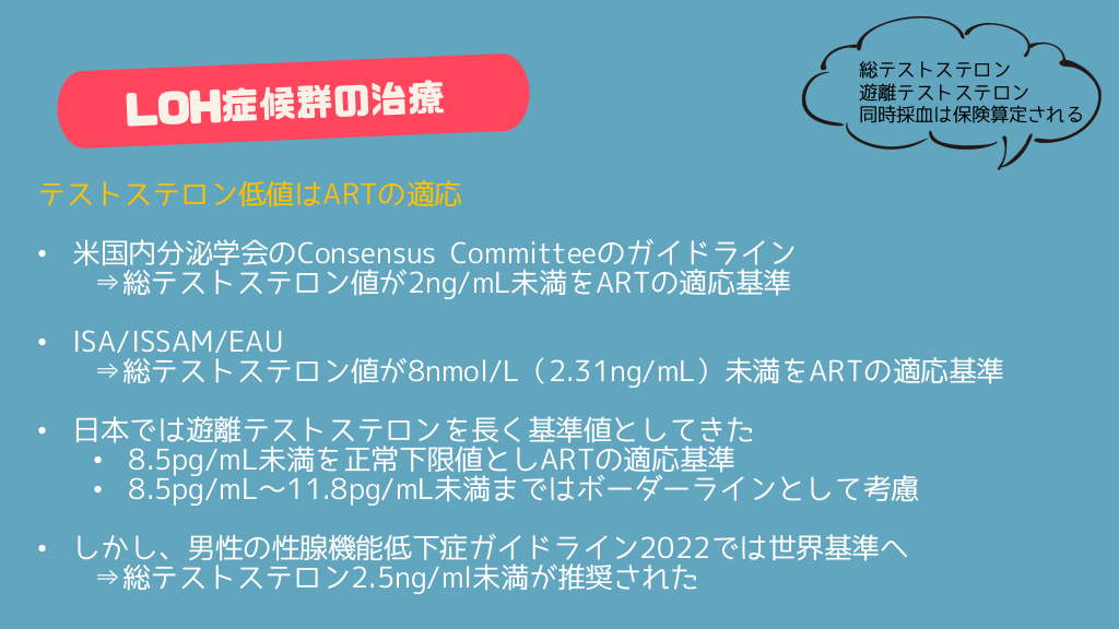 総テストステロン 遊離テストステロン 同時採血は保険算定される テストステロン低値はARTの適応 • 米国内分泌学会のConsensus Committeeのガイドライン ⇒総テストステロン値が2ng/mL未満をARTの適応基準 • ISA/ISSAM/EAU ⇒総テストステロン値が8nmol/L(2.31ng/mL)未満をARTの適応基準 • 日本では遊離テストステロンを長く基準値としてきた • 8.5pg/mL未満を正常下限値としARTの適応基準 • 8.5pg/mL~11.8pg/mL未満まではボーダーラインとして考慮 • しかし、男性の性腺機能低下症ガイドライン2022では世界基準へ ⇒総テストステロン2.5ng/ml未満が推奨された #18.