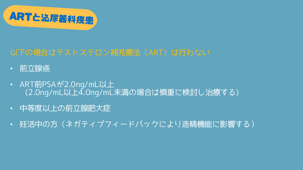以下の場合はテストステロン補充療法(ART)は行わない • 前立腺癌 • ART前PSAが2.0ng/mL以上 (2.0ng/mL以上4.0ng/mL未満の場合は慎重に検討し治療する) • 中等度以上の前立腺肥大症 • 妊活中の方(ネガティブフィードバックにより造精機能に影響する) #20.