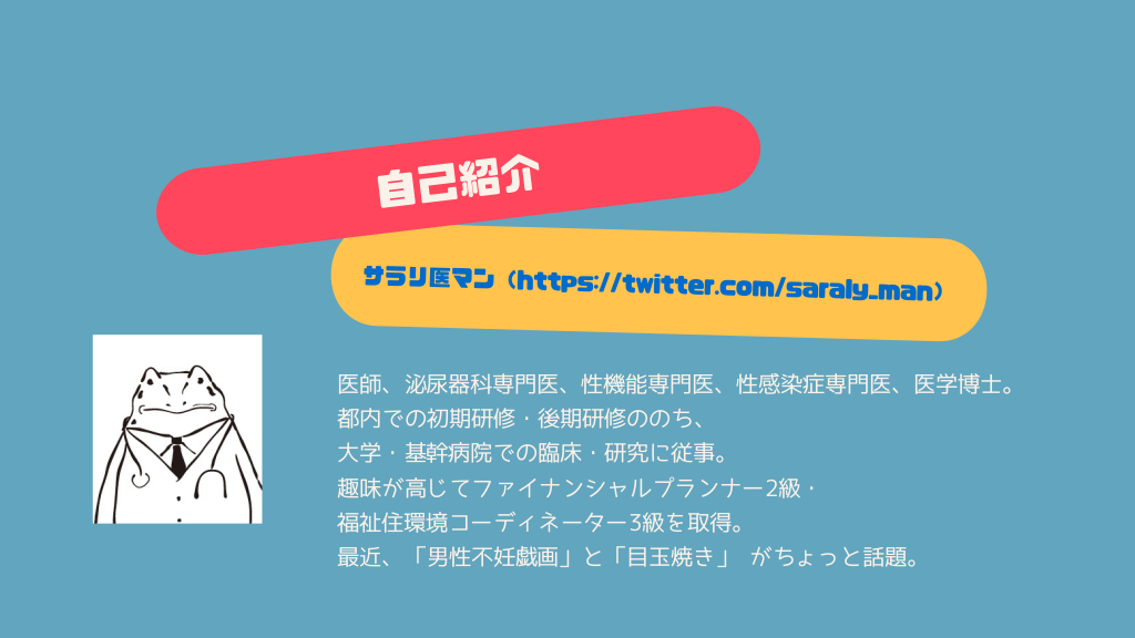 医師、泌尿器科専門医、性機能専門医、性感染症専門医、医学博士。 都内での初期研修・後期研修ののち、 大学・基幹病院での臨床・研究に従事。 趣味が高じてファイナンシャルプランナー2級・ 福祉住環境コーディネーター3級を取得。 最近、「男性不妊戯画」と「目玉焼き」 がちょっと話題。 #3.