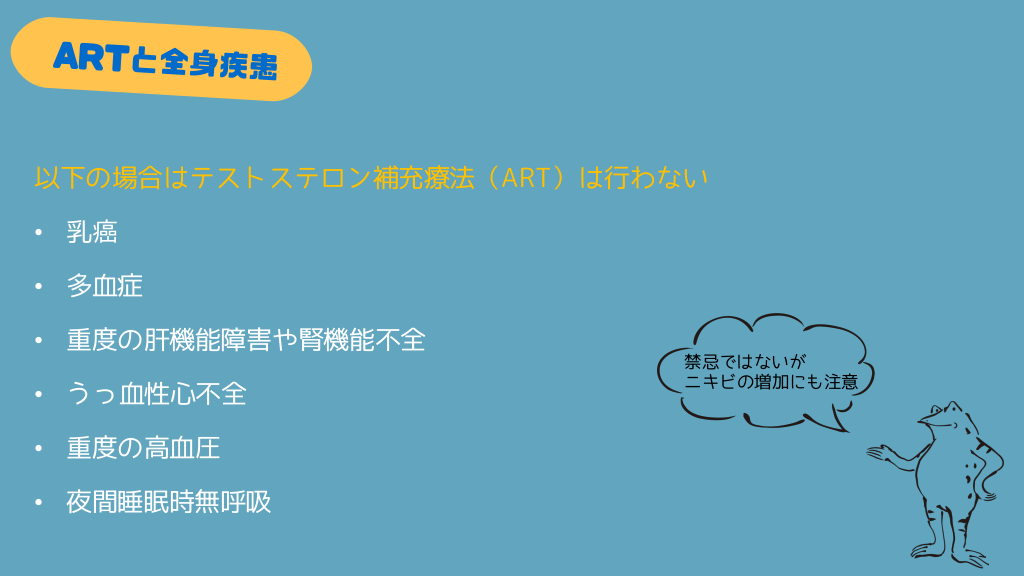 以下の場合はテストステロン補充療法(ART)は行わない • 乳癌 • 多血症 • 重度の肝機能障害や腎機能不全 • うっ血性心不全 • 重度の高血圧 • 夜間睡眠時無呼吸 禁忌ではないが ニキビの増加にも注意 男性更年期外来での対応と治療方針 #21.
