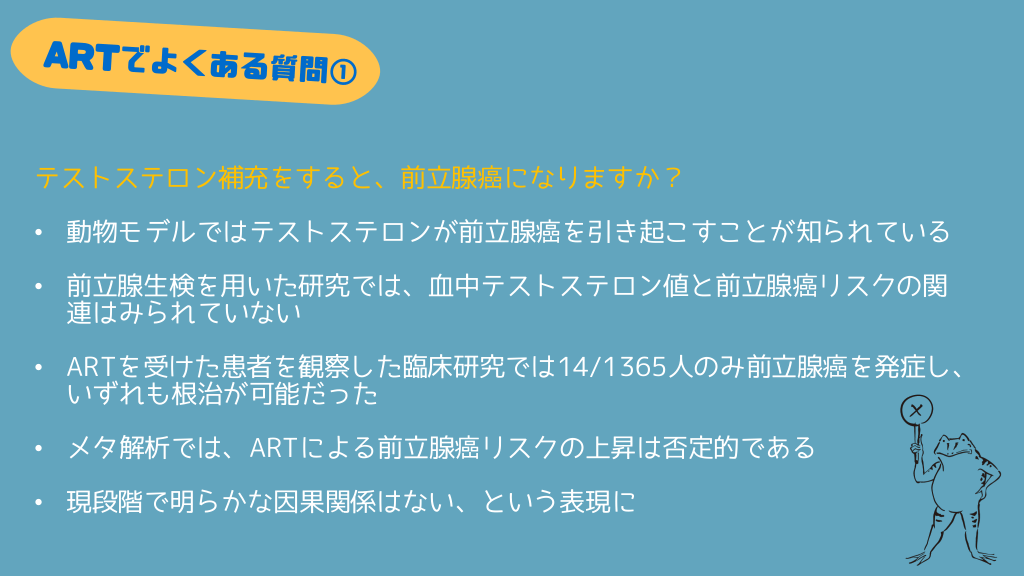 テストステロン補充をすると、前立腺癌になりますか? • 動物モデルではテストステロンが前立腺癌を引き起こすことが知られている • 前立腺生検を用いた研究では、血中テストステロン値と前立腺癌リスクの関 連はみられていない • ARTを受けた患者を観察した臨床研究では14/1365人のみ前立腺癌を発症し、 いずれも根治が可能だった • メタ解析では、ARTによる前立腺癌リスクの上昇は否定的である • 現段階で明らかな因果関係はない、という表現に #22.