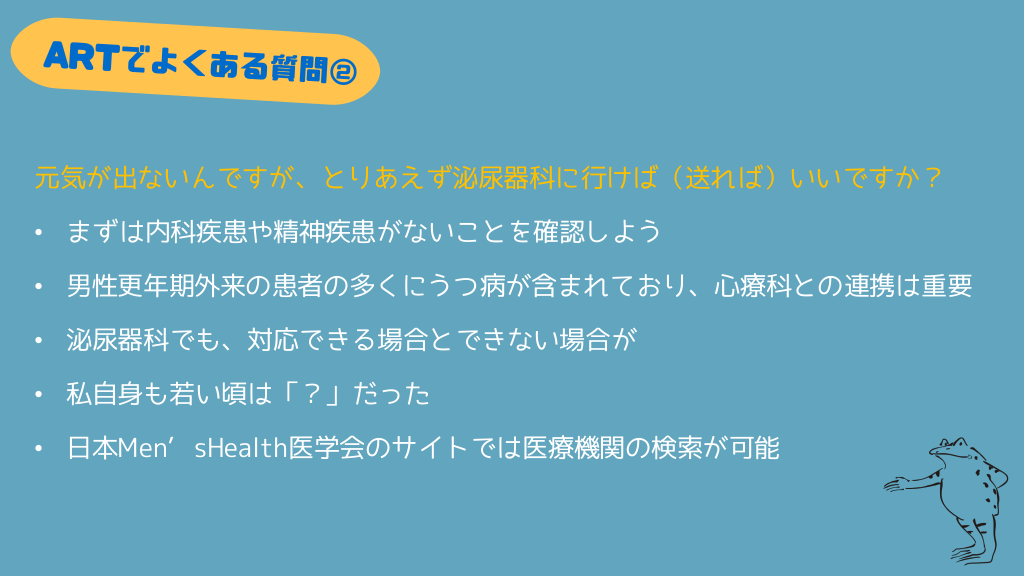 元気が出ないんですが、とりあえず泌尿器科に行けば(送れば)いいですか? • まずは内科疾患や精神疾患がないことを確認しよう • 男性更年期外来の患者の多くにうつ病が含まれており、心療科との連携は重要 • 泌尿器科でも、対応できる場合とできない場合が • 私自身も若い頃は「?」だった • 日本Men’sHealth医学会のサイトでは医療機関の検索が可能 #23.