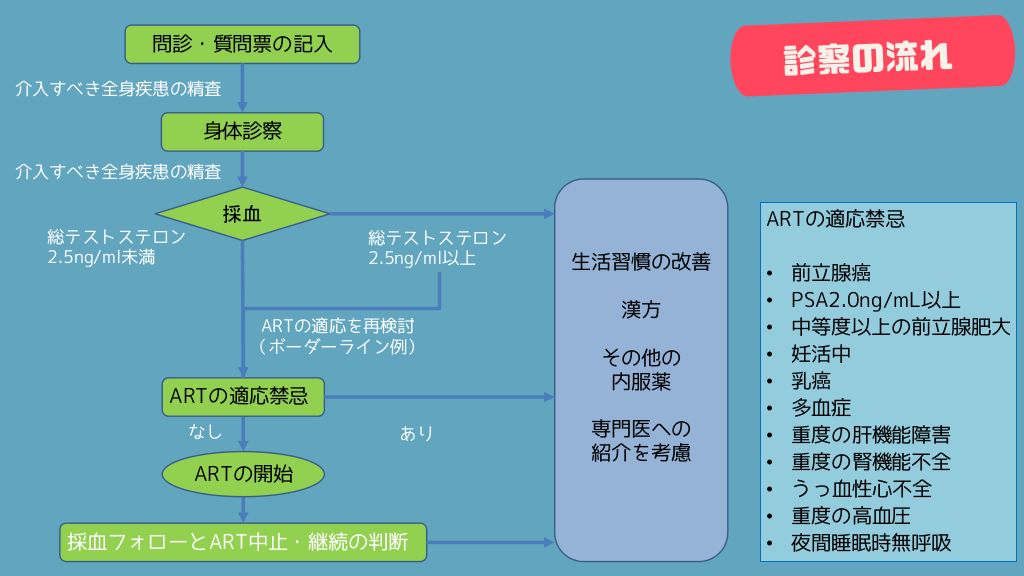 問診・質問票の記入 介入すべき全身疾患の精査 身体診察 介入すべき全身疾患の精査 採血 総テストステロン 2.5ng/ml未満 総テストステロン 2.5ng/ml以上 ARTの適応を再検討 (ボーダーライン例) ARTの適応禁忌 なし あり ARTの開始 採血フォローとART中止・継続の判断 ARTの適応禁忌 生活習慣の改善 漢方 その他の 内服薬 専門医への 紹介を考慮 • • • • • • • • • • • 前立腺癌 PSA2.0ng/mL以上 中等度以上の前立腺肥大 妊活中 乳癌 多血症 重度の肝機能障害 重度の腎機能不全 うっ血性心不全 重度の高血圧 夜間睡眠時無呼吸 #25.