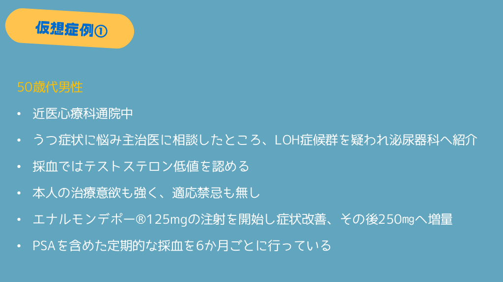 50歳代男性 • 近医心療科通院中 • うつ症状に悩み主治医に相談したところ、LOH症候群を疑われ泌尿器科へ紹介 • 採血ではテストステロン低値を認める • 本人の治療意欲も強く、適応禁忌も無し • エナルモンデポー®125mgの注射を開始し症状改善、その後250㎎へ増量 • PSAを含めた定期的な採血を6か月ごとに行っている #26.