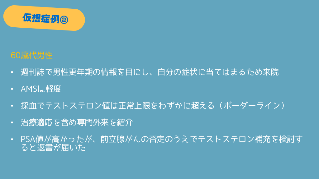 60歳代男性 • 週刊誌で男性更年期の情報を目にし、自分の症状に当てはまるため来院 • AMSは軽度 • 採血でテストステロン値は正常上限をわずかに超える(ボーダーライン) • 治療適応を含め専門外来を紹介 • PSA値が高かったが、前立腺がんの否定のうえでテストステロン補充を検討す ると返書が届いた #27.