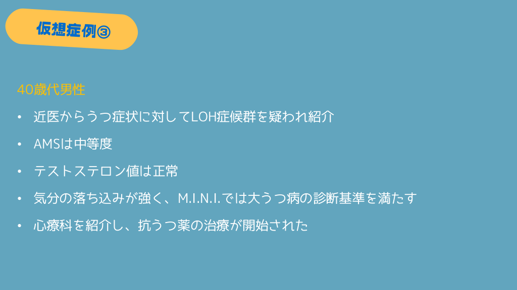 40歳代男性 • 近医からうつ症状に対してLOH症候群を疑われ紹介 • AMSは中等度 • テストステロン値は正常 • 気分の落ち込みが強く、M.I.N.I.では大うつ病の診断基準を満たす • 心療科を紹介し、抗うつ薬の治療が開始された #28.