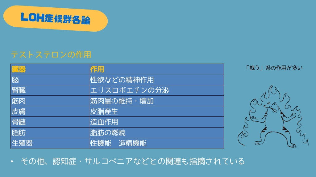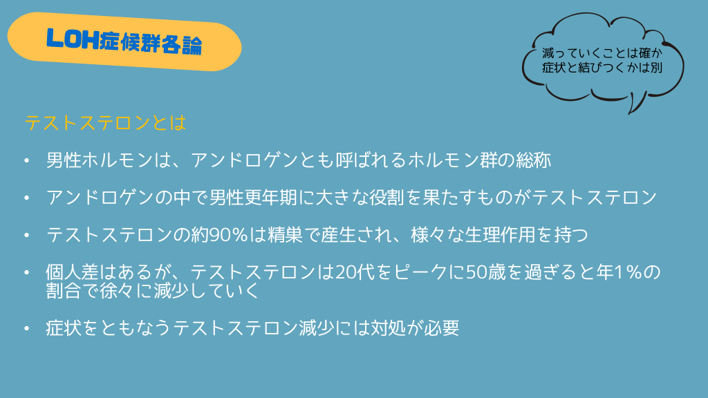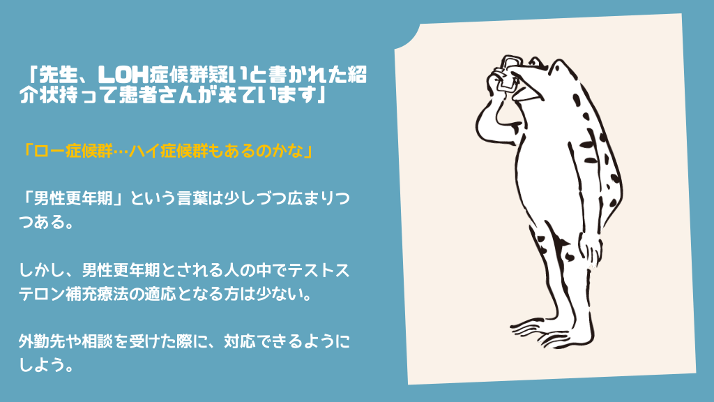 「先生、LOH症候群疑いと書かれた紹 介状持って患者さんが来ています」 「ロー症候群…ハイ症候群もあるのかな」 「男性更年期」という言葉は少しづつ広まりつ つある。 しかし、男性更年期とされる人の中でテストス テロン補充療法の適応となる方は少ない。 外勤先や相談を受けた際に、対応できるように しよう。 LOH症候群の定義と症状 #4.