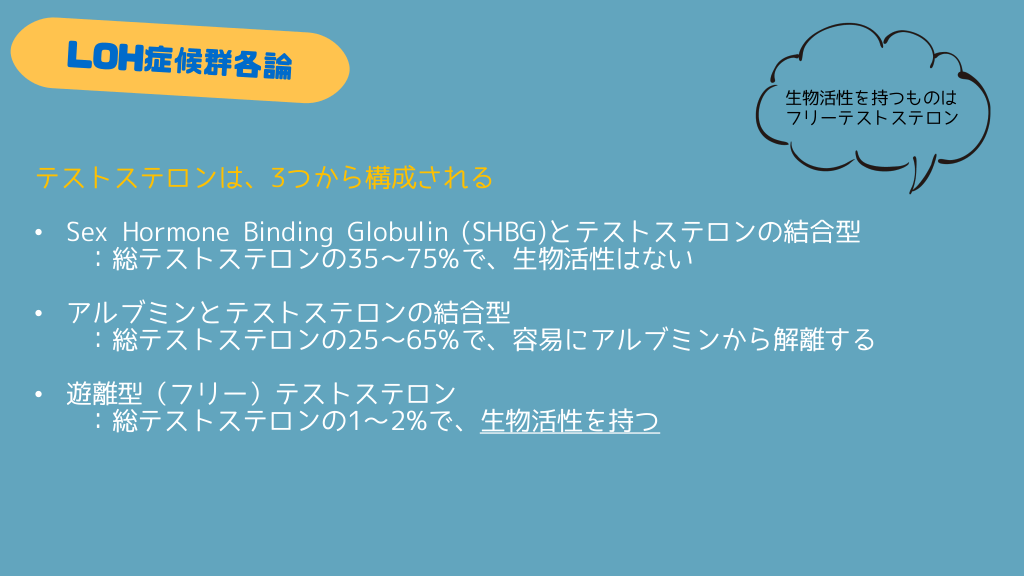 生物活性を持つものは フリーテストステロン テストステロンは、3つから構成される • Sex Hormone Binding Globulin (SHBG)とテストステロンの結合型 :総テストステロンの35~75%で、生物活性はない • アルブミンとテストステロンの結合型 :総テストステロンの25~65%で、容易にアルブミンから解離する • 遊離型(フリー)テストステロン :総テストステロンの1~2%で、生物活性を持つ #10.
