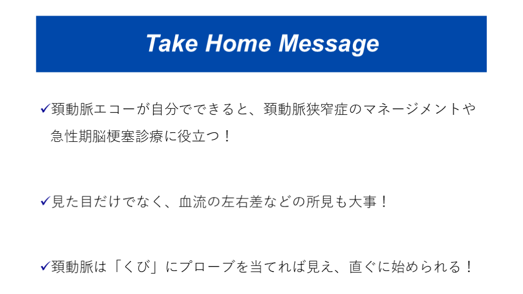 #2. Take Home Message 頚動脈エコーが自分でできると、頚動脈狭窄症のマネージメントや急性期脳梗塞診療に役立つ!