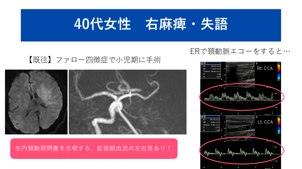 #3. 40代女性 右麻痺・失語 Rt. CCA Lt. CCA 【既往】ファロー四徴症で小児期に手術 ERで頚動脈エコーをすると… 実は心原性脳塞栓による左内頚動脈閉塞… 左内頚動脈閉塞を示唆する、拡張期血流の左右差あり!