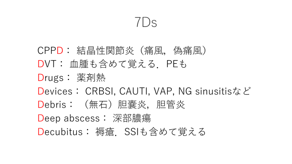 「5大医療関連感染症」と「7Ds」の疾患がないか考える