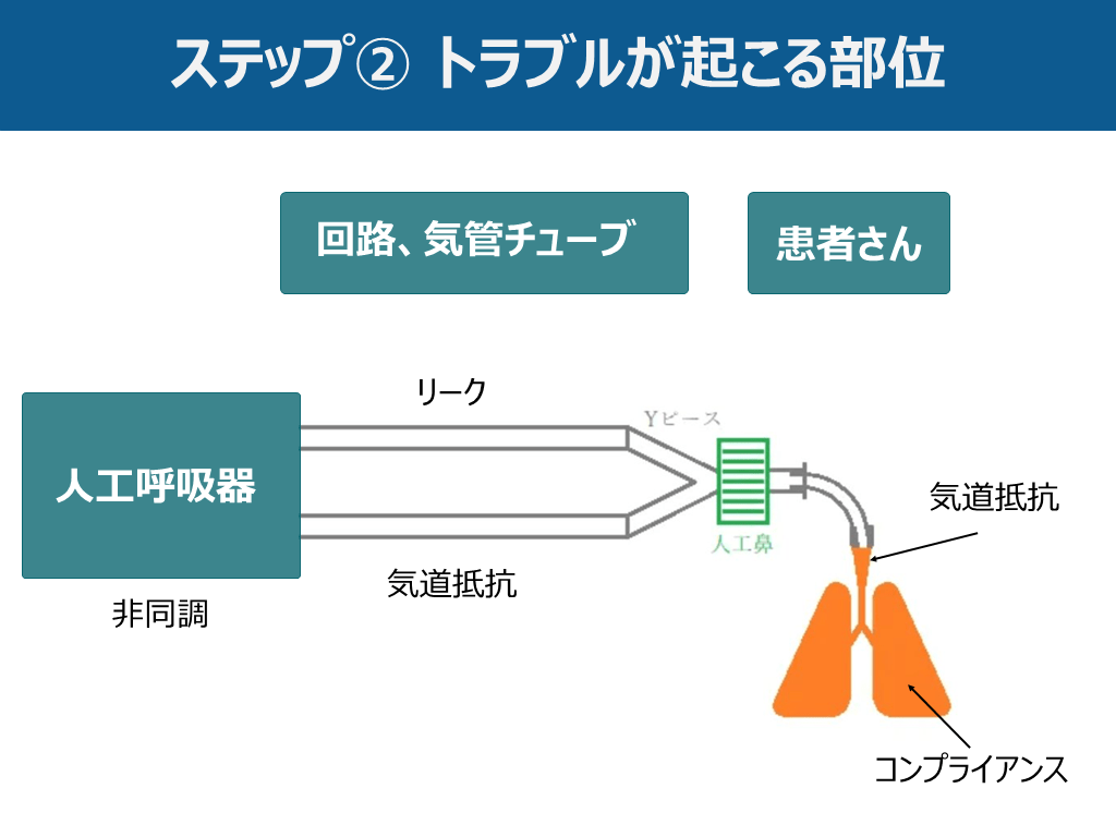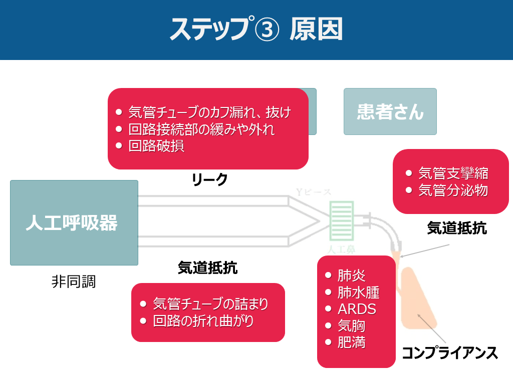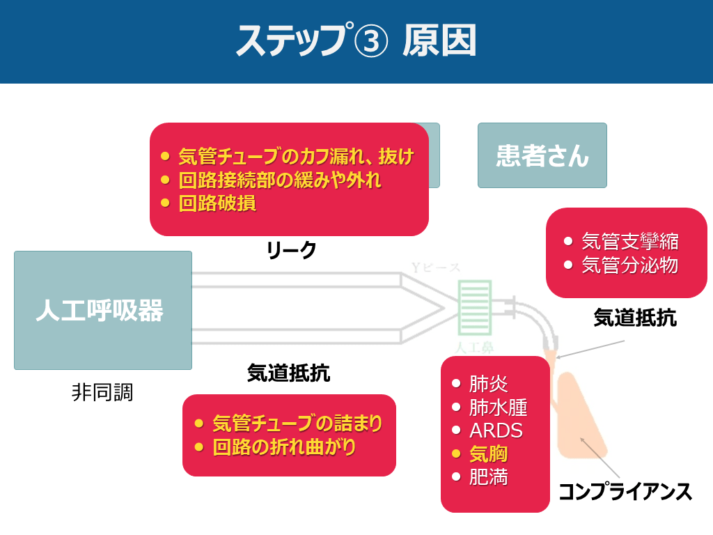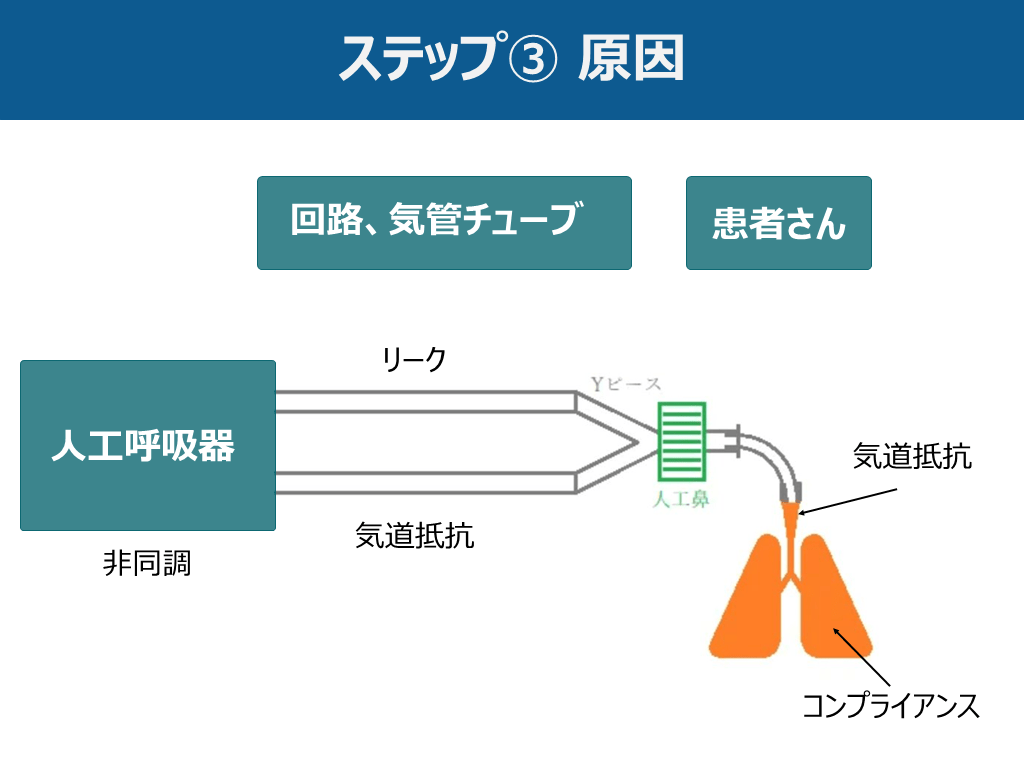 #22. ステップ③ 原因 リーク 非同調 気道抵抗 気道抵抗 コンプライアンス