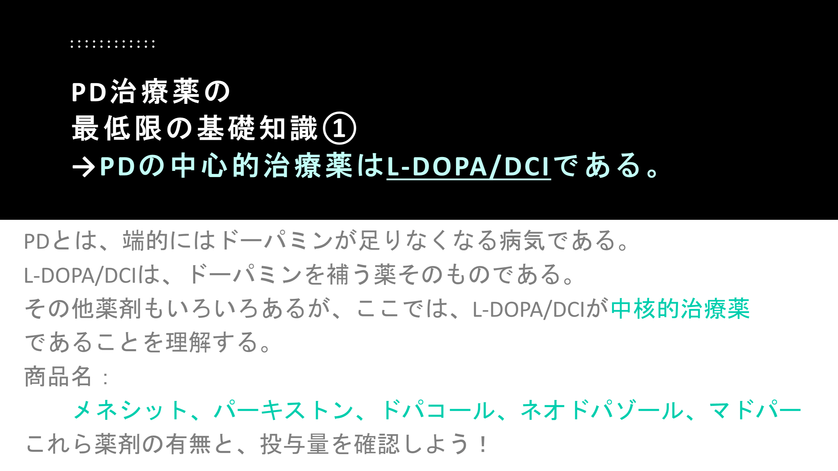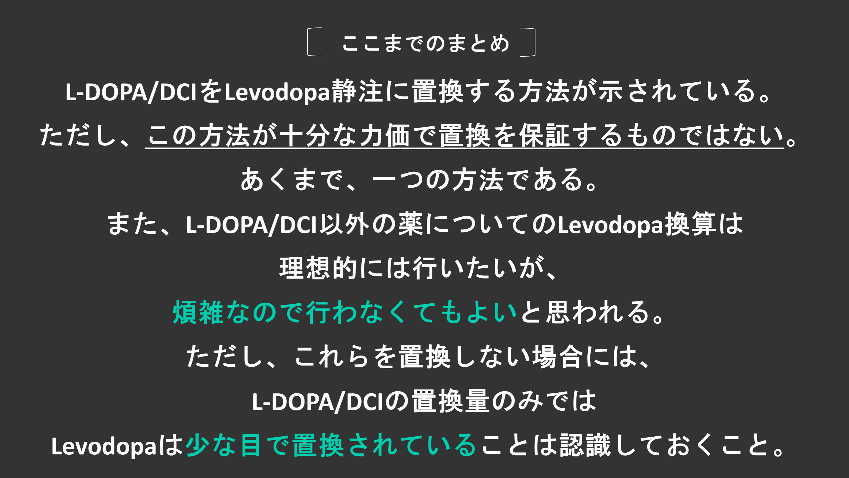 Levodopaは少な目で置換されていることは認識しておくこと。 ここまでのまとめ