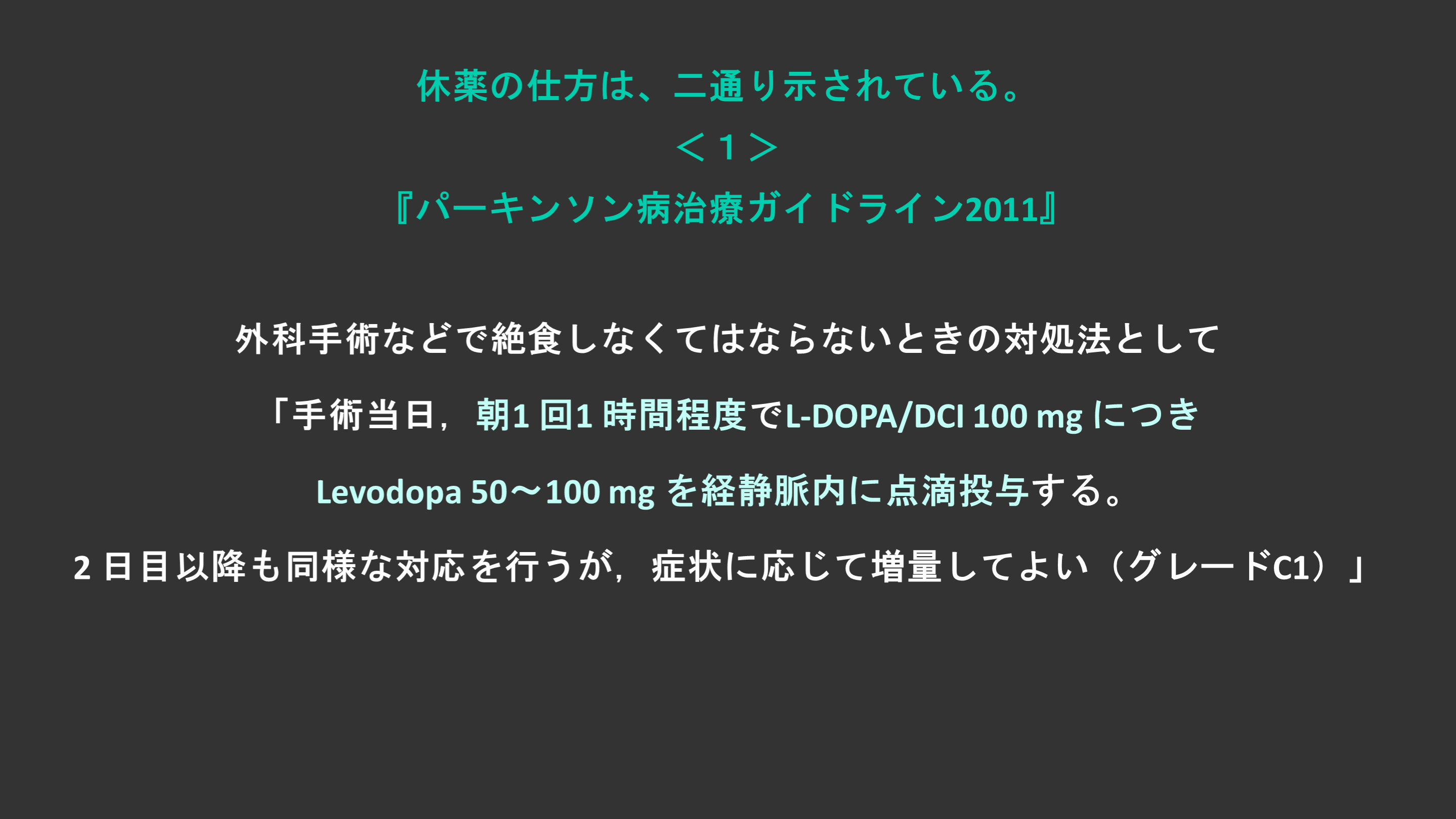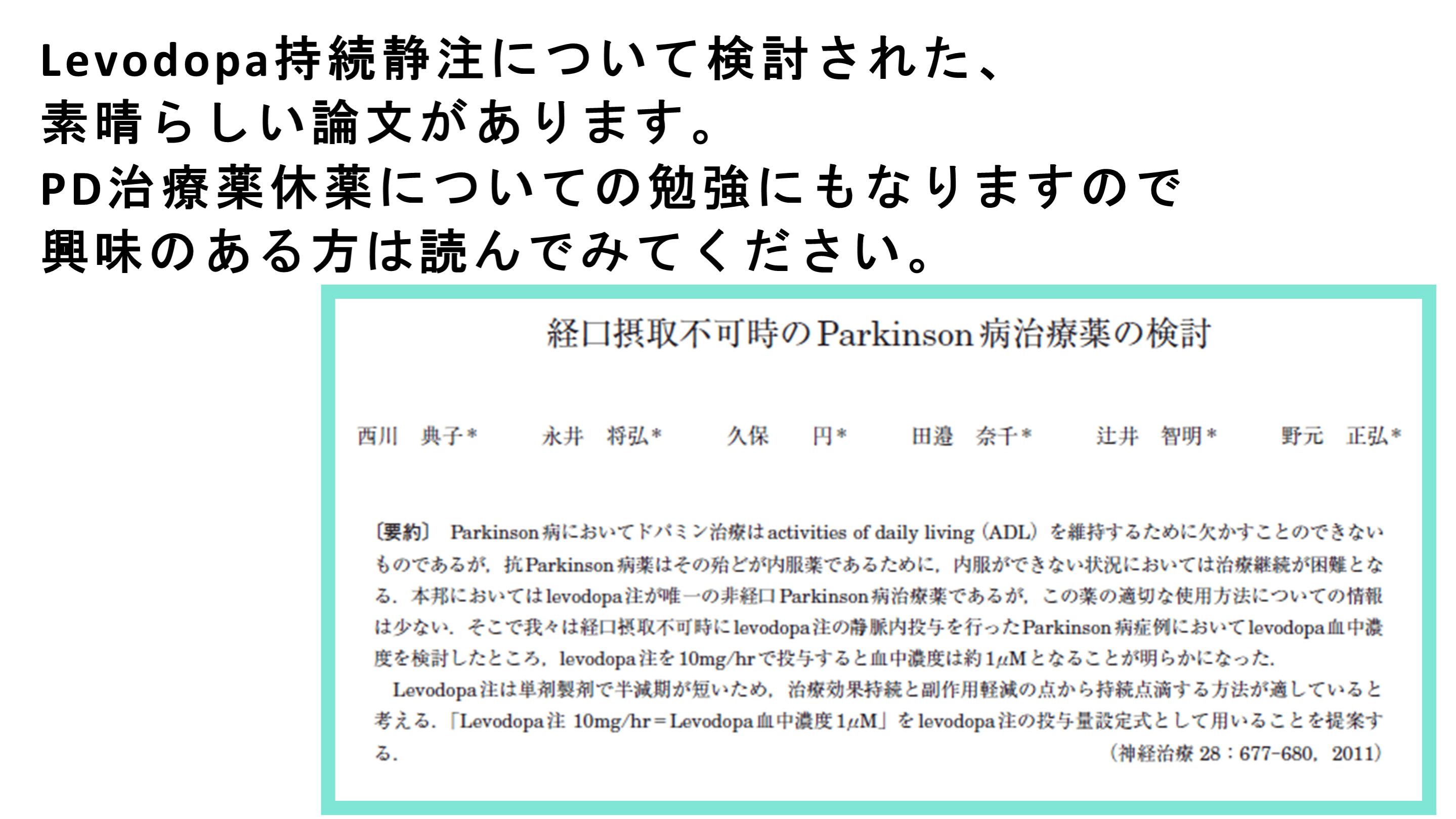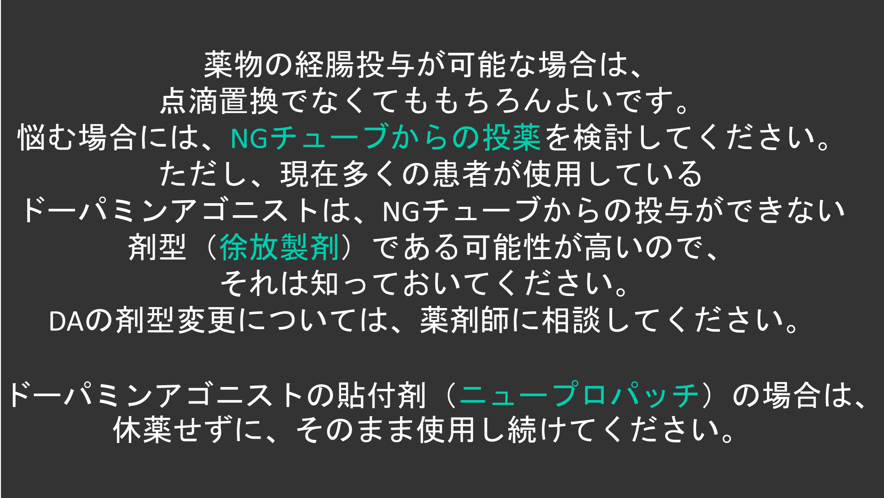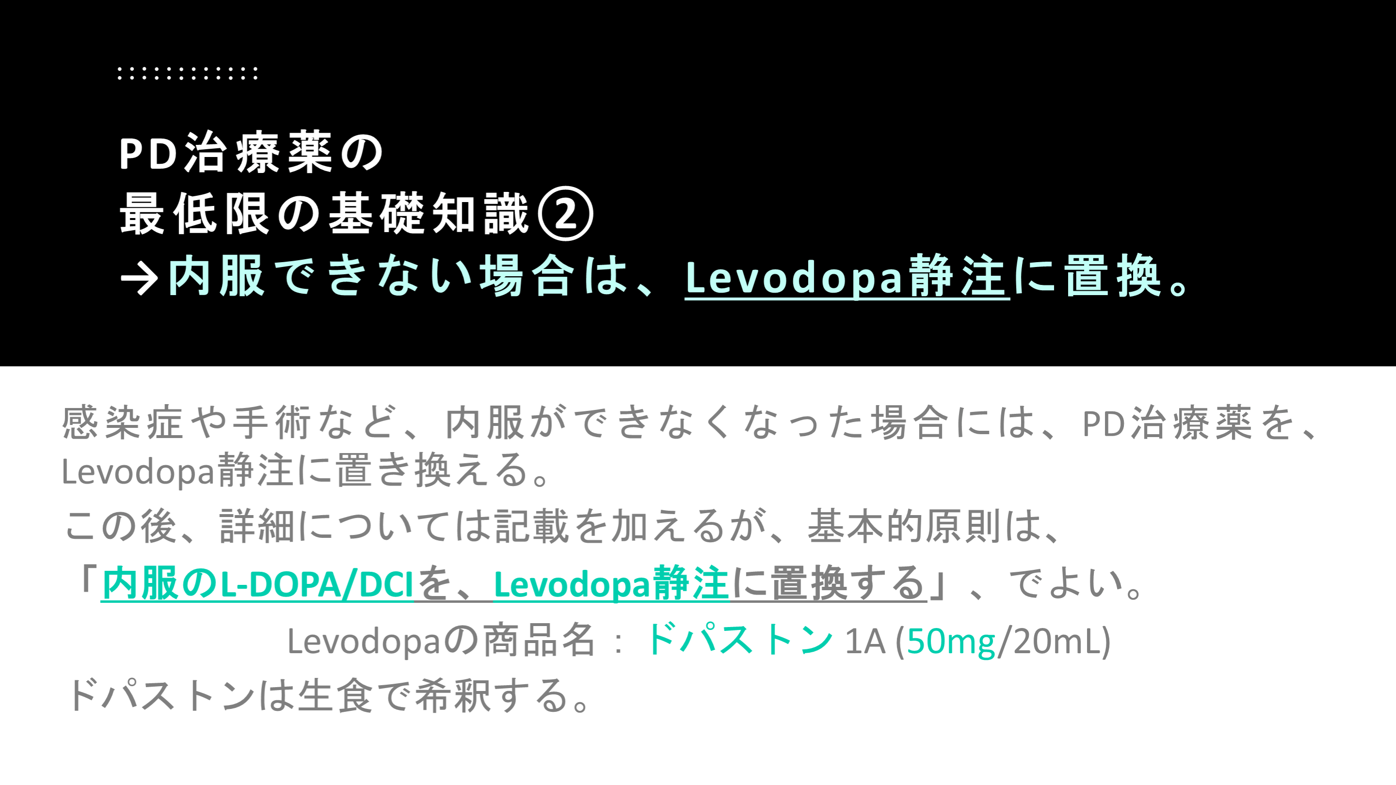 #4. 感染症や手術など、内服ができなくなった場合には、PD治療薬を、Levodopa静注に置き換える。