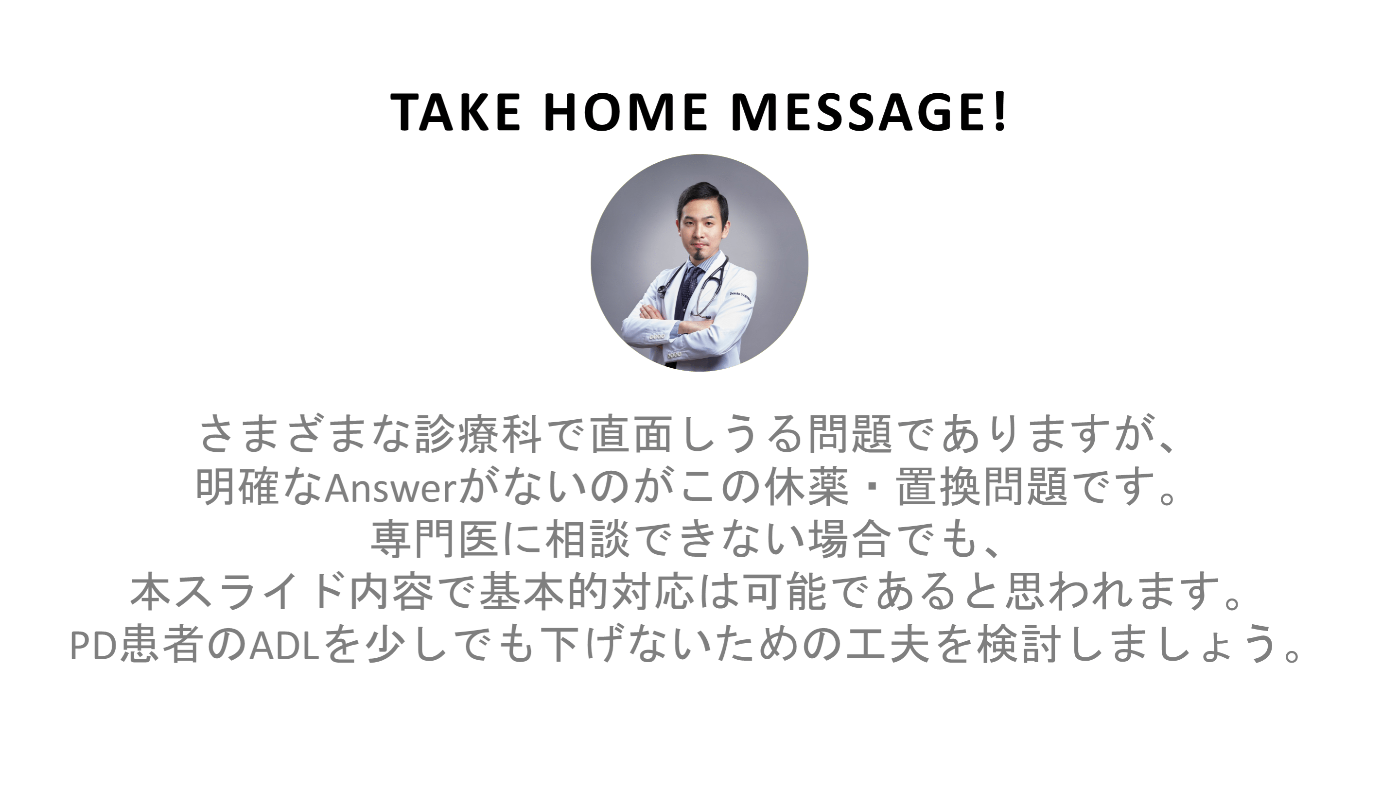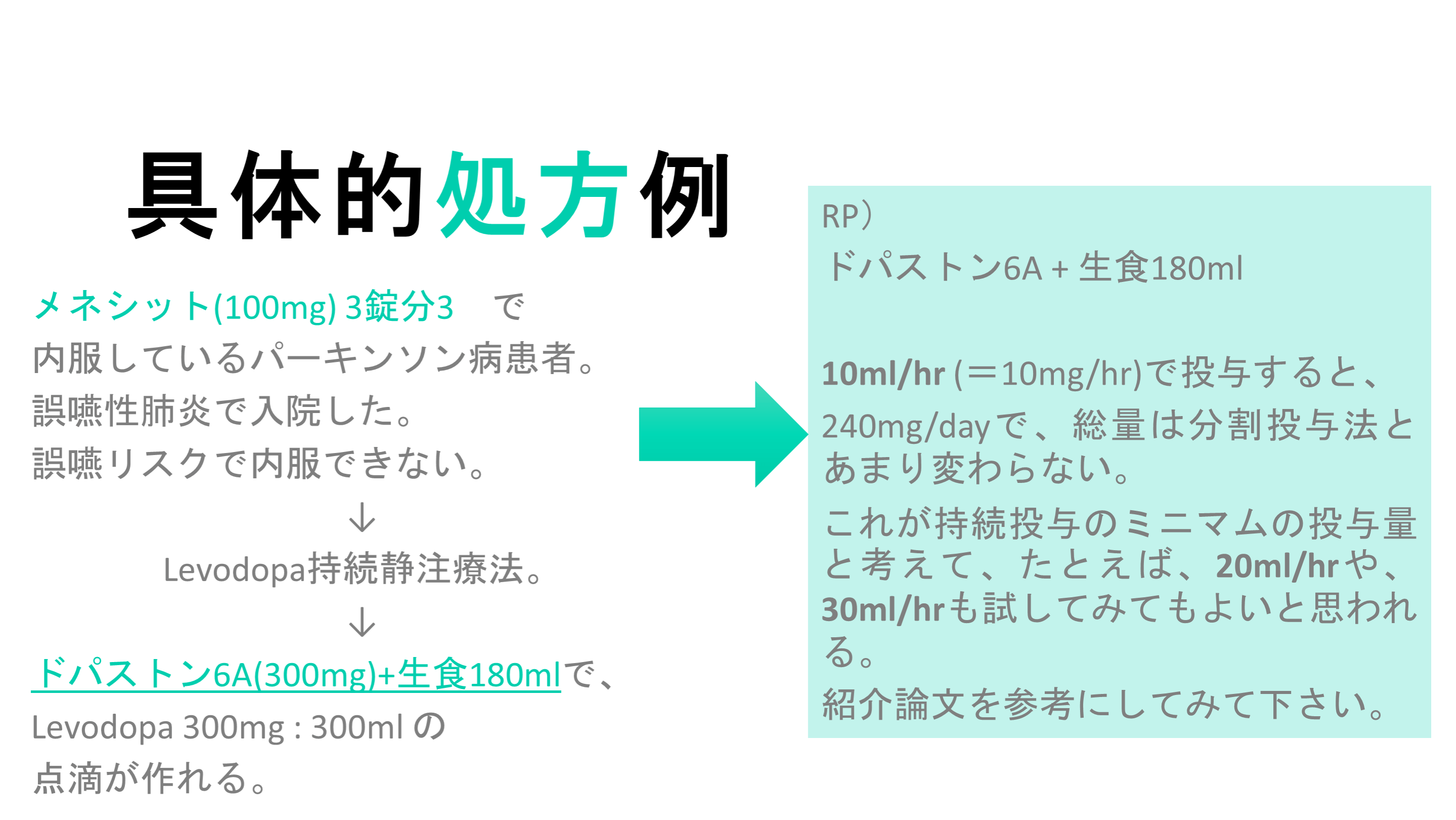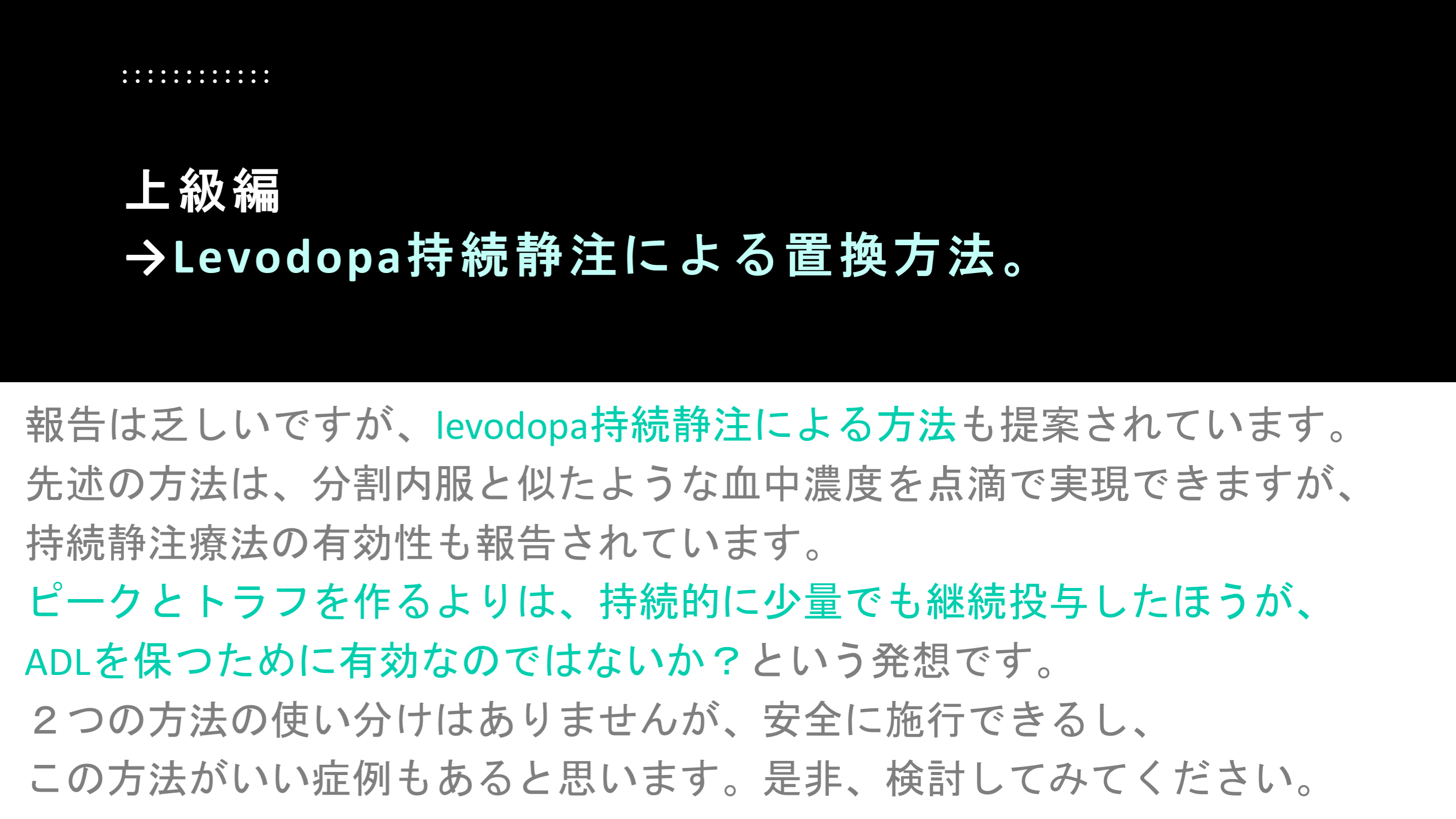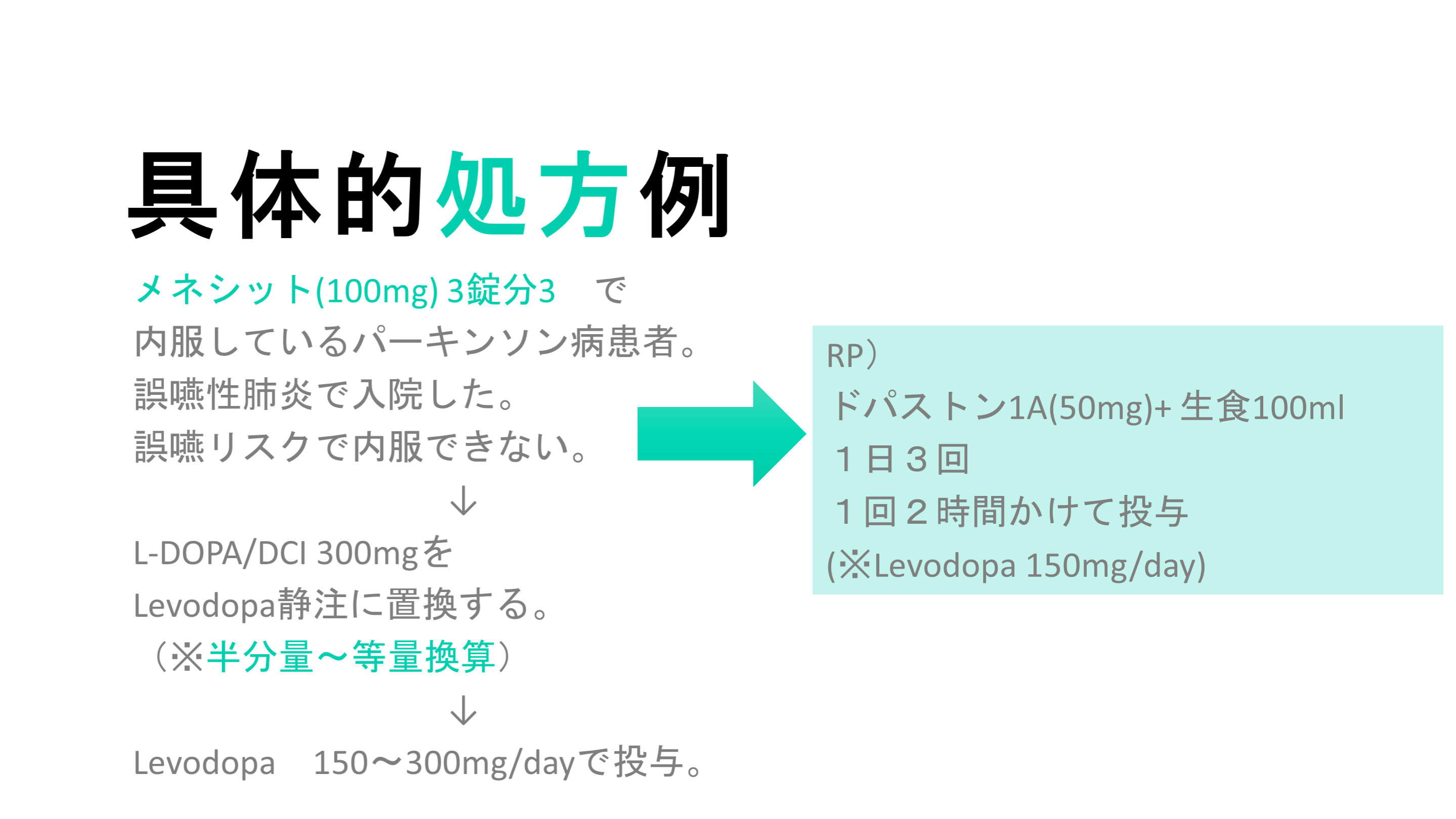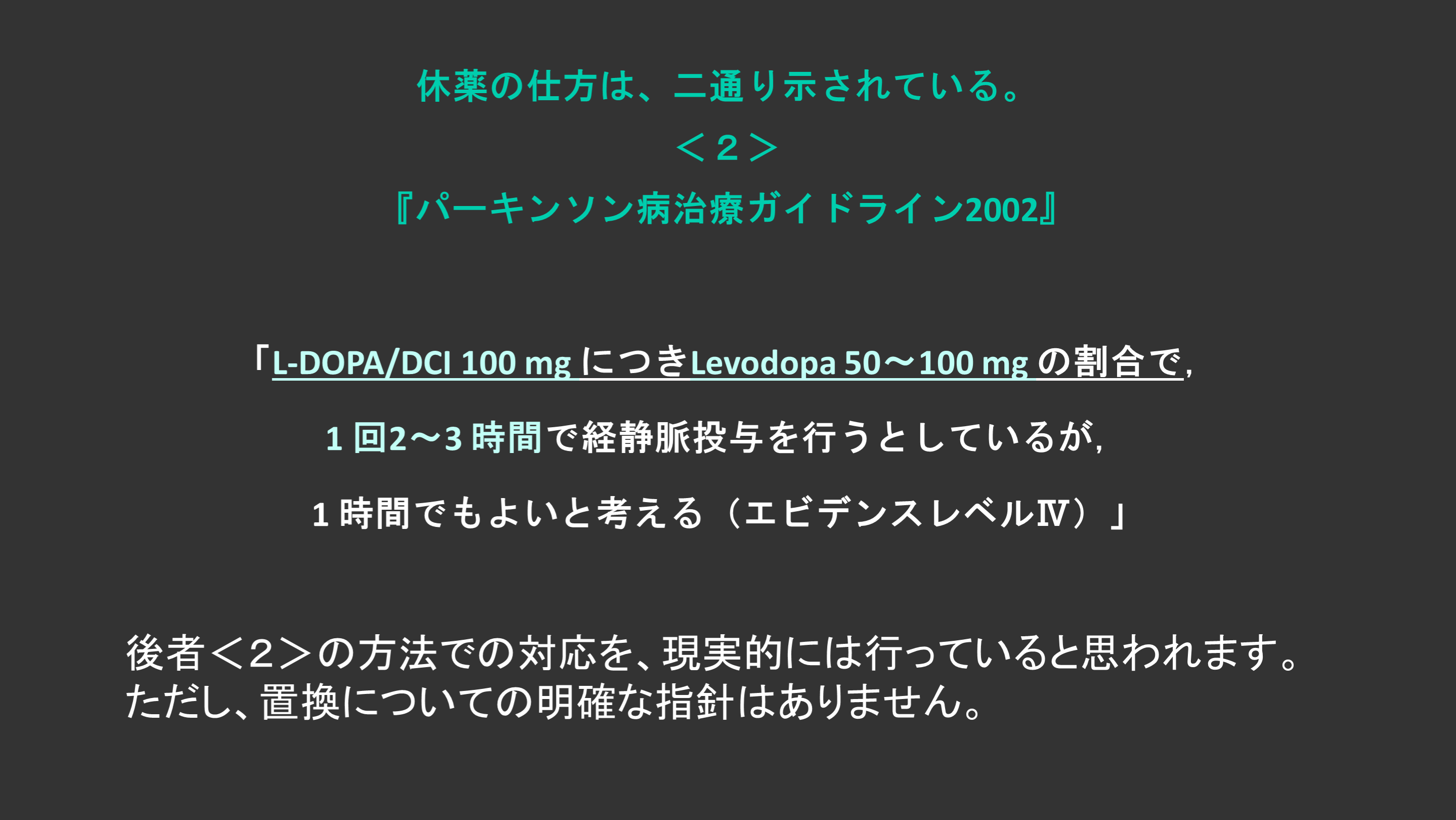 #4. 感染症や手術など、内服ができなくなった場合には、PD治療薬を、Levodopa静注に置き換える。