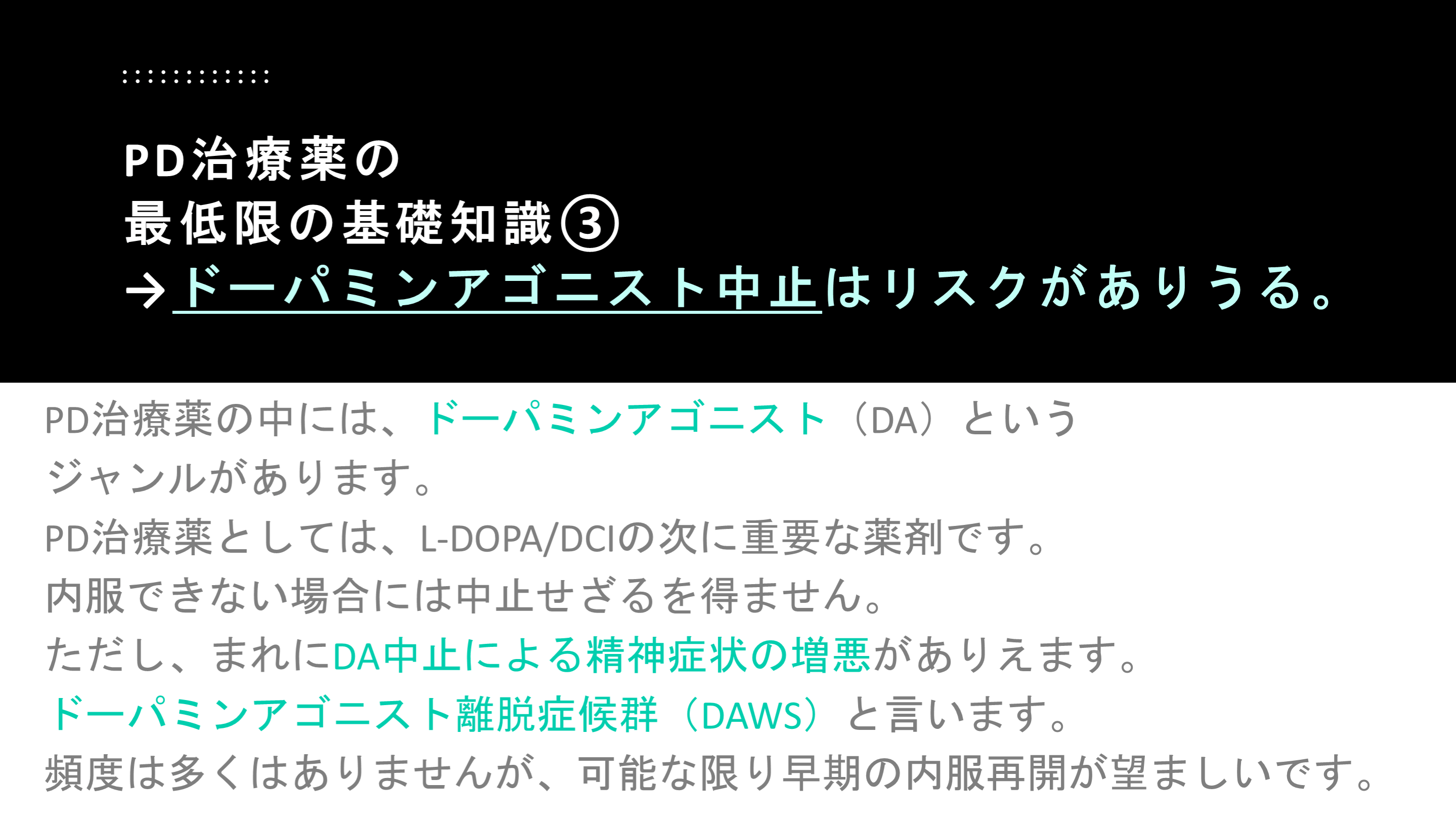 →ドーパミンアゴニスト中止はリスクがありうる。