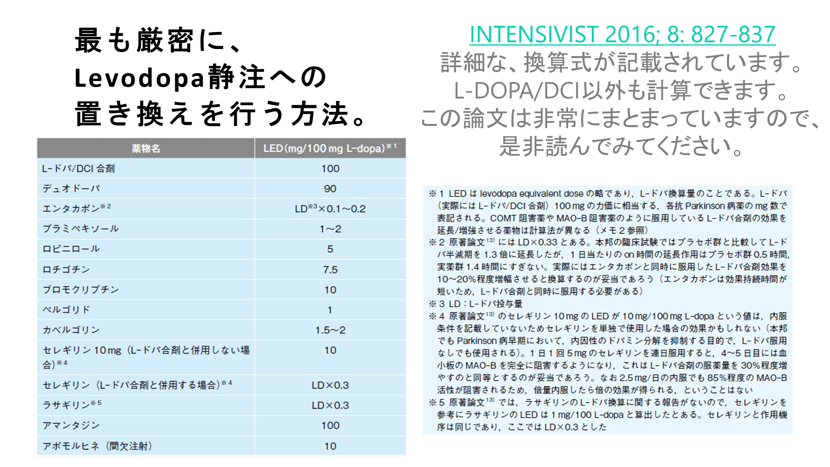 また、L-DOPA/DCI以外の薬についてのLevodopa換算は