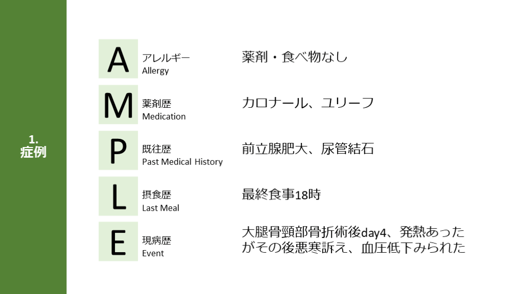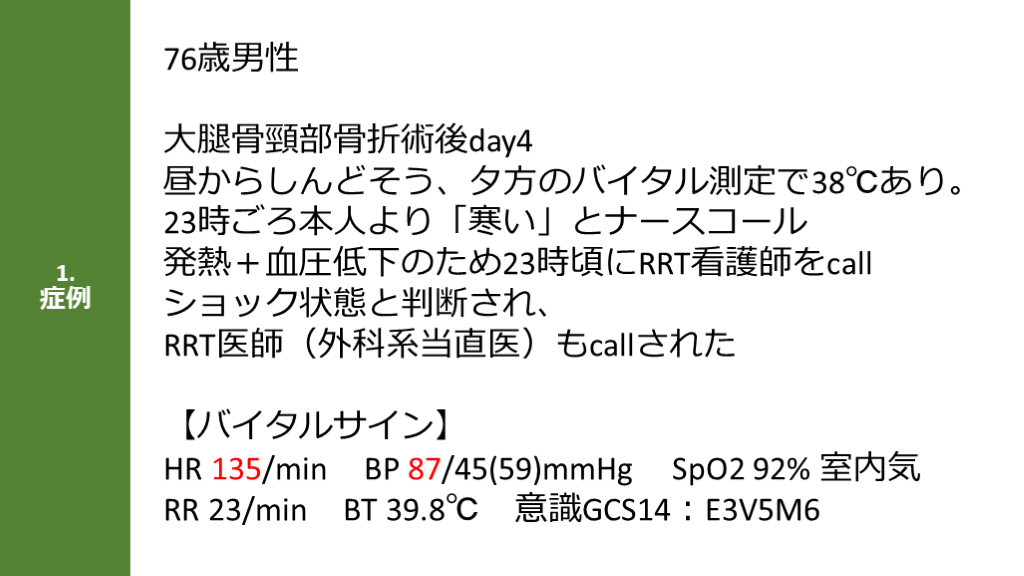 Event 薬剤・食べ物なし カロナール、ユリーフ 前立腺肥大、尿管結石 最終食事18時 大腿骨頸部骨折術後day4、発熱あったがその後悪寒訴え、血圧低下みられた