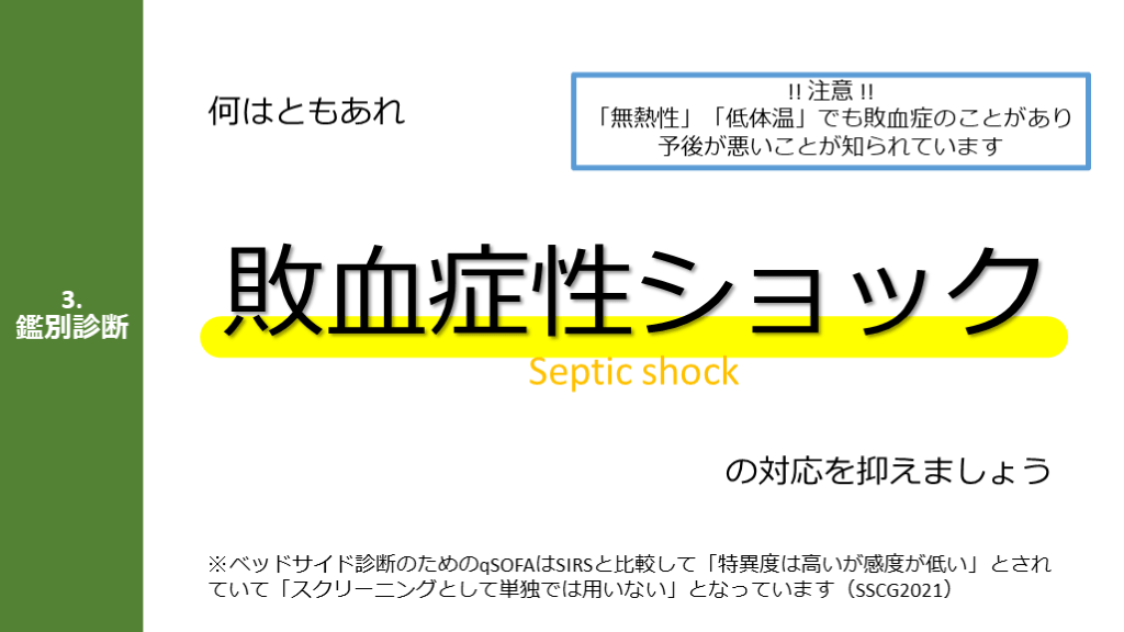 #8. 3.鑑別診断 敗血症性ショック の対応を抑えましょう Septic shock 何はともあれ ※ベッドサイド診断のためのqSOFAはSIRSと比較して「特異度は高いが感度が低い」とされていて「スクリーニングとして単独では用いない」となっています(SSCG2021) !! 注意 !!