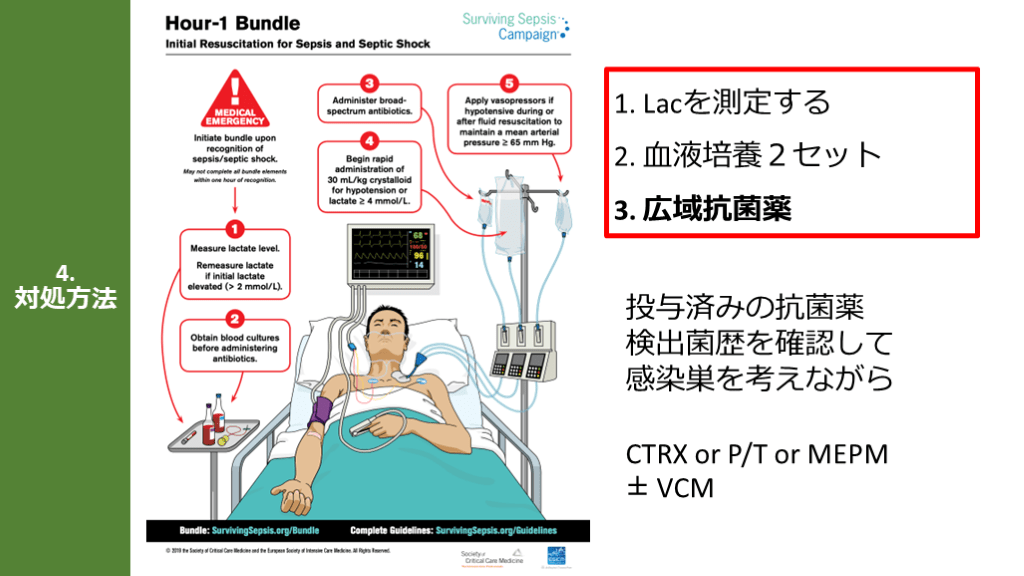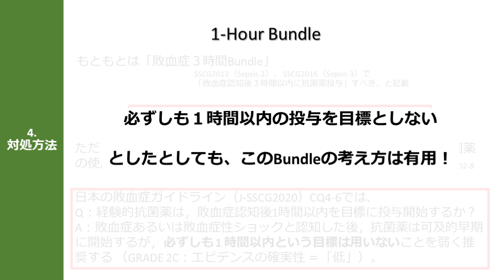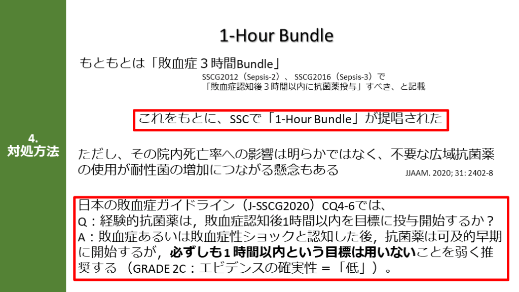 #11. ただし、その院内死亡率への影響は明らかではなく、不要な広域抗菌薬の使用が耐性菌の増加につながる懸念もある 4.対処方法 1-Hour Bundle 日本の敗血症ガイドライン(J-SSCG2020)CQ4-6では、