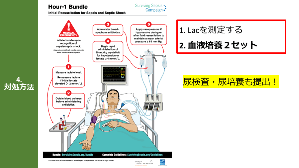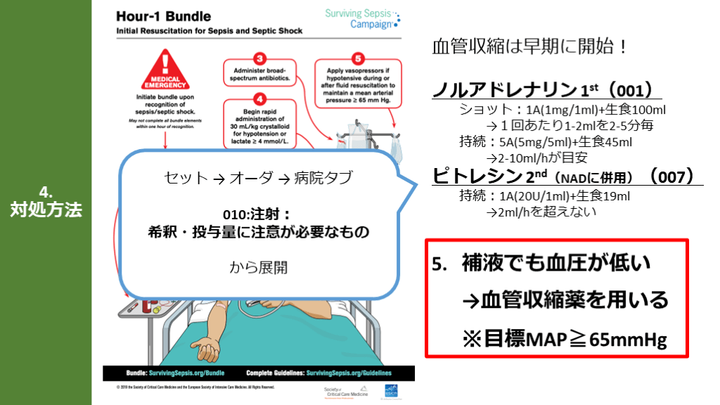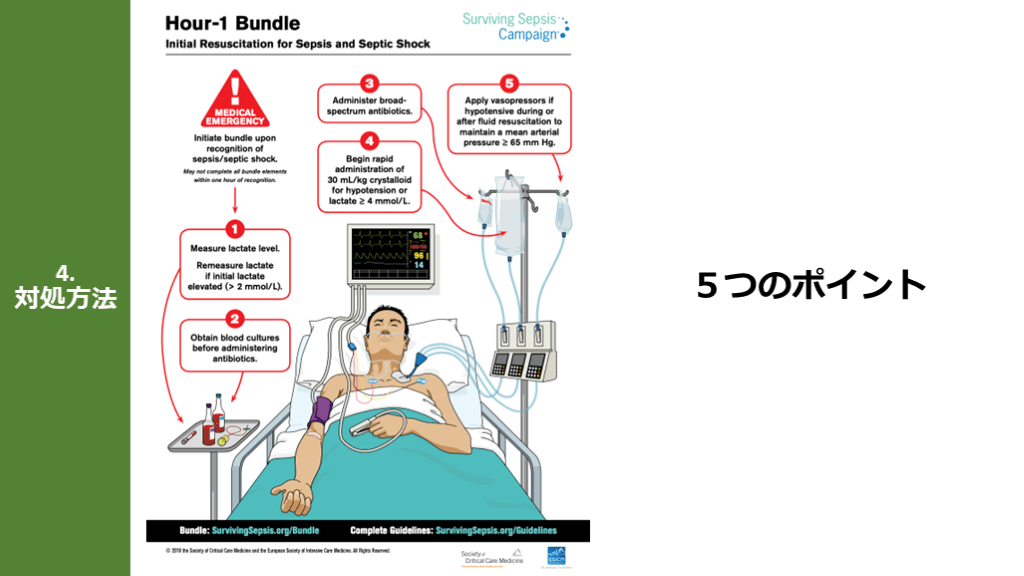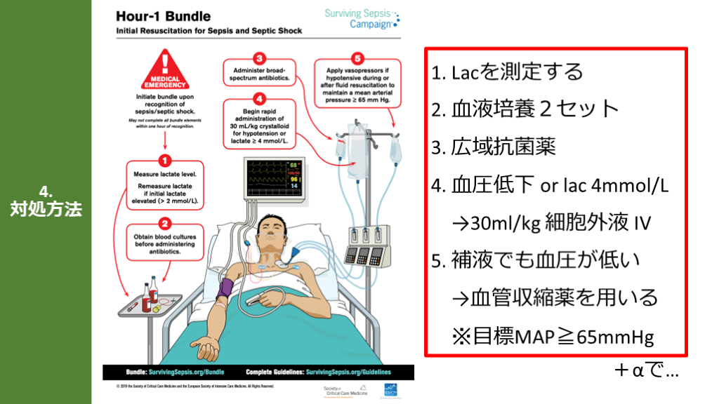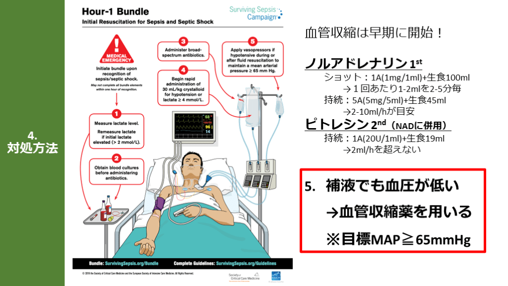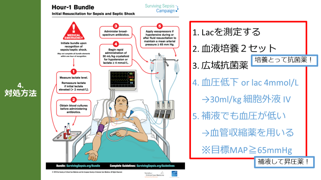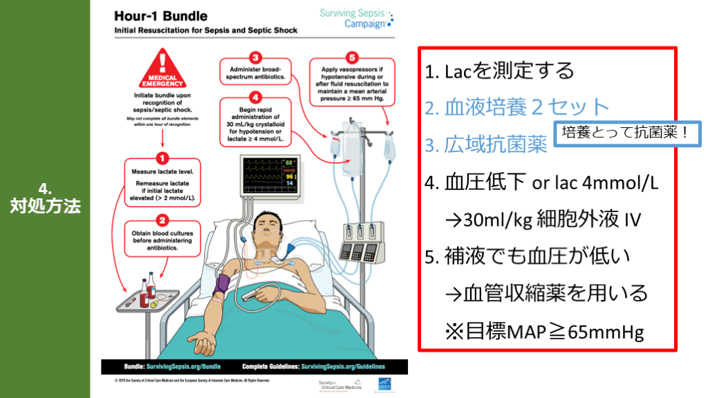 Hour-1 Bundleの「5つのポイント」「目標MAP65mmHg」 培養とって抗菌薬!補液して昇圧薬!