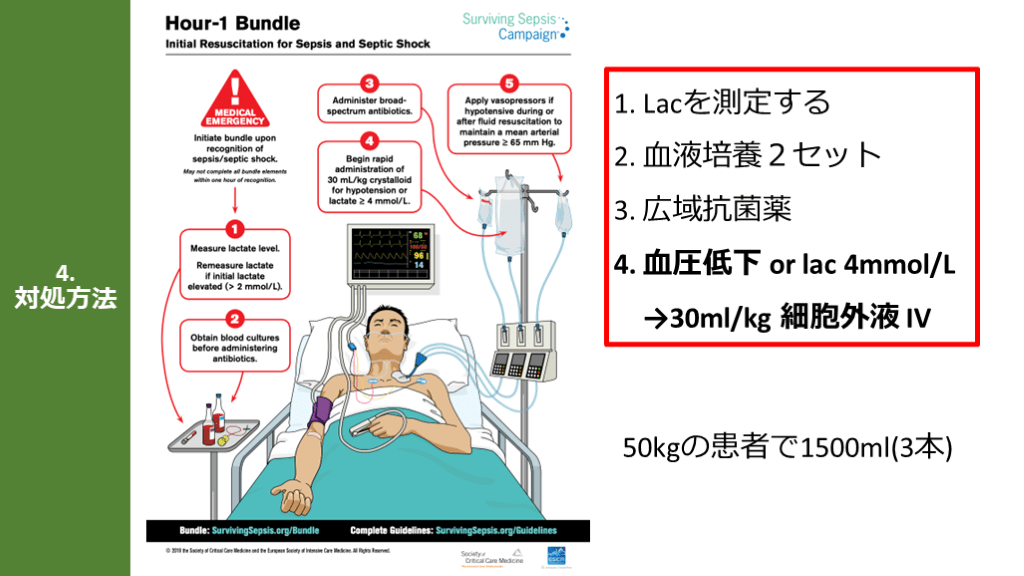 血圧低下 or lac 4mmol/L→30ml/kg 細胞外液 IV 50kgの患者で1500ml(3本)