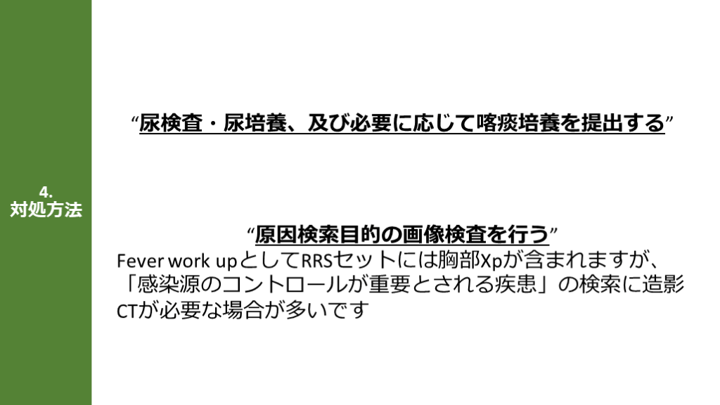 #22. 4.対処方法 “尿検査・尿培養、及び必要に応じて喀痰培養を提出する” “原因検索目的の画像検査を行う”