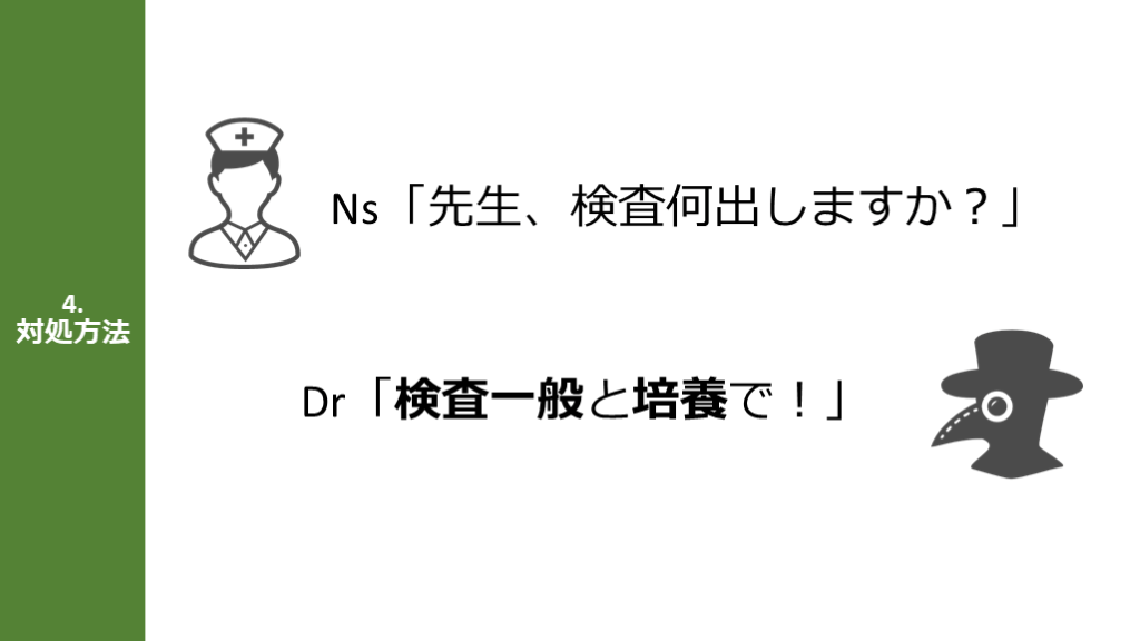 #23. 4.対処方法 Ns「先生、検査何出しますか?」 Dr「検査一般と培養で!」