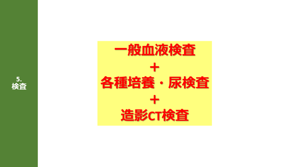 オーダーは一般検査 + 各種培養 ±(造影)CT