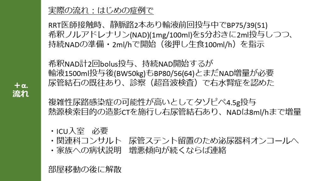 #29. +α.流れ 実際の流れ:はじめの症例で RRT医師接触時、静脈路2本あり輸液前回投与中でBP75/39(51)
