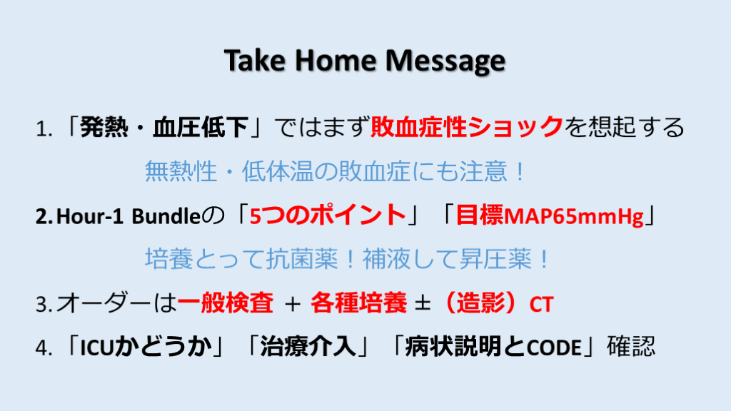 #30. Take Home Message 「発熱・血圧低下」ではまず敗血症性ショックを想起する 無熱性・低体温の敗血症にも注意!