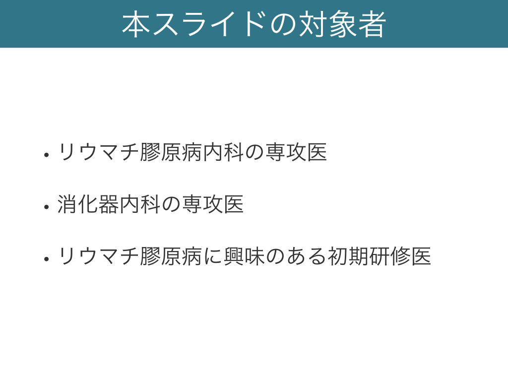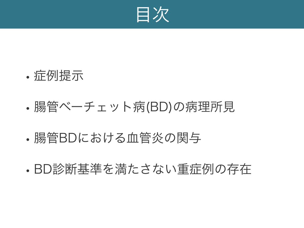 腸管ベーチェット病(BD)の症例を元に、病理所見や血管炎の関与等を解説しました。リウマチ膠原病内科の専攻医、消化器内科の専攻医、リウマチ膠原病に興味のある初期研修医を対象としたスライドです。