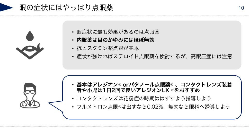 #10. 眼の症状にはやっぱり点眼薬 • 眼症状に最も効果があるのは点眼薬 • 内服薬は目のかゆみにはほぼ無効 • 抗ヒスタミン薬点眼が基本 • 症状が強ければステロイド点眼薬を検討するが、高眼圧症には注意 • 基本はアレジオン® orパタノール点眼薬® 、コンタクトレンズ装着 者や小児は1日2回で良いアレジオンLX ®をおすすめ • コンタクトレンズは花粉症の時期ははずすよう指導しよう • フルメトロン点眼®は出すなら0.02%、無効なら眼科へ誘導しよう 10