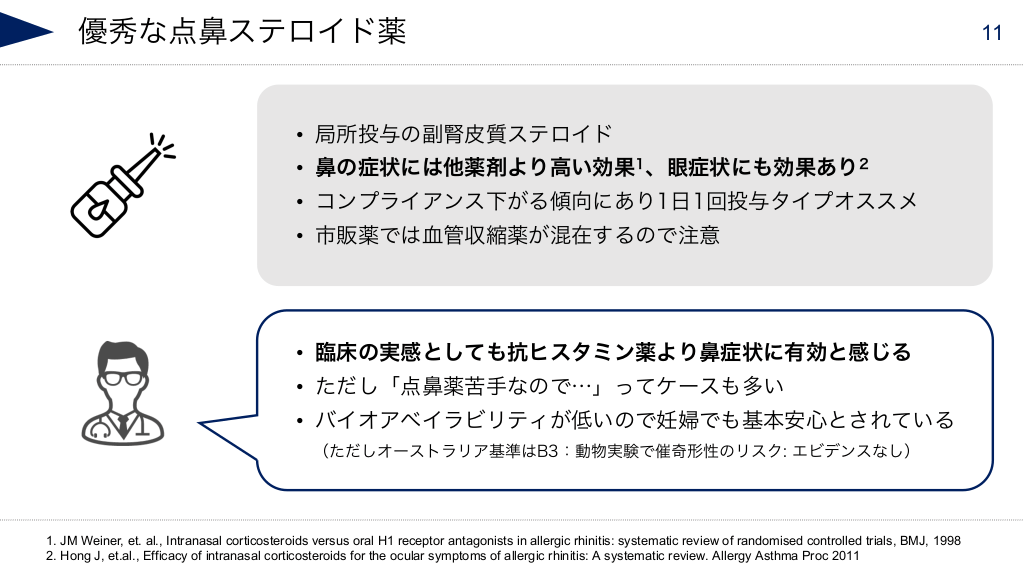 #11. 優秀な点鼻ステロイド薬 • 局所投与の副腎皮質ステロイド • 鼻の症状には他薬剤より高い効果1、眼症状にも効果あり2 • コンプライアンス下がる傾向にあり1日1回投与タイプオススメ • 市販薬では血管収縮薬が混在するので注意 • 臨床の実感としても抗ヒスタミン薬より鼻症状に有効と感じる • ただし「点鼻薬苦手なので…」ってケースも多い • バイオアベイラビリティが低いので妊婦でも基本安心とされている (ただしオーストラリア基準はB3:動物実験で催奇形性のリスク: エビデンスなし) 1. JM Weiner, et. al., Intranasal corticosteroids versus oral H1 receptor antagonists in allergic rhinitis: systematic review of randomised controlled trials, BMJ, 1998 2. Hong J, et.al., Efficacy of intranasal corticosteroids for the ocular symptoms of allergic rhinitis: A systematic review. Allergy Asthma Proc 2011 11