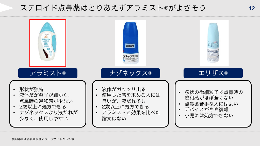 #12. ステロイド点鼻薬はとりあえずアラミスト®がよさそう アラミスト® • 形状が独特 • 液体だが粒子が細かく、 点鼻時の違和感が少ない • 2歳以上に処方できる • ナゾネックスより液だれが 少なく、使用しやすい 製剤写真は各製薬会社のウェブサイトから転載 ナゾネックス® • 液体がガッツリ出る • 使用した感を求める人には 良いが、液だれ多し • 2歳以上に処方できる • アラミストと効果を比べた 論文はない エリザス® • 粉状の微細粒子で点鼻時の 違和感がほぼ全くない • 点鼻薬苦手な人にはよい • デバイスがやや複雑 • 小児には処方できない 12