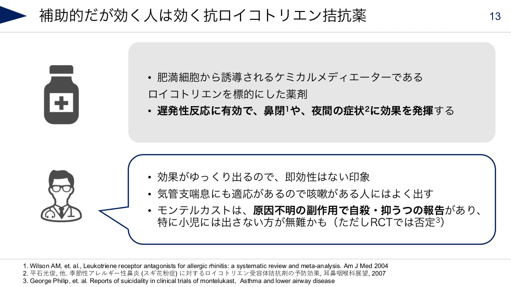 #13. 補助的だが効く人は効く抗ロイコトリエン拮抗薬 • 肥満細胞から誘導されるケミカルメディエーターである ロイコトリエンを標的にした薬剤 • 遅発性反応に有効で、鼻閉1や、夜間の症状2に効果を発揮する • 効果がゆっくり出るので、即効性はない印象 • 気管支喘息にも適応があるので咳嗽がある人にはよく出す • モンテルカストは、原因不明の副作用で自殺・抑うつの報告があり、 特に小児には出さない方が無難かも(ただしRCTでは否定3) 1. Wilson AM, et. al., Leukotriene receptor antagonists for allergic rhinitis: a systematic review and meta-analysis. Am J Med 2004 2. 平⽯光俊, 他. 季節性アレルギー性⿐炎 (スギ花粉症) に対するロイコトリエン受容体拮抗剤の予防効果, ⽿⿐咽喉科展望, 2007 3. George Philip, et. al. Reports of suicidality in clinical trials of montelukast, Asthma and lower airway disease 13