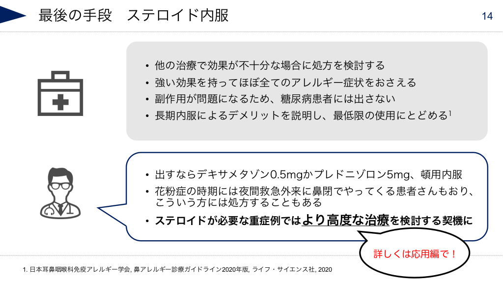 #14. 最後の手段 ステロイド内服 14 • 他の治療で効果が不十分な場合に処方を検討する • 強い効果を持ってほぼ全てのアレルギー症状をおさえる • 副作用が問題になるため、糖尿病患者には出さない • 長期内服によるデメリットを説明し、最低限の使用にとどめる1 • 出すならデキサメタゾン0.5mgかプレドニゾロン5mg、頓用内服 • 花粉症の時期には夜間救急外来に鼻閉でやってくる患者さんもおり、 こういう方には処方することもある • ステロイドが必要な重症例ではより高度な治療を検討する契機に 詳しくは応用編で! 1. 日本耳鼻咽喉科免疫アレルギー学会, 鼻アレルギー診療ガイドライン2020年版, ライフ・サイエンス社, 2020