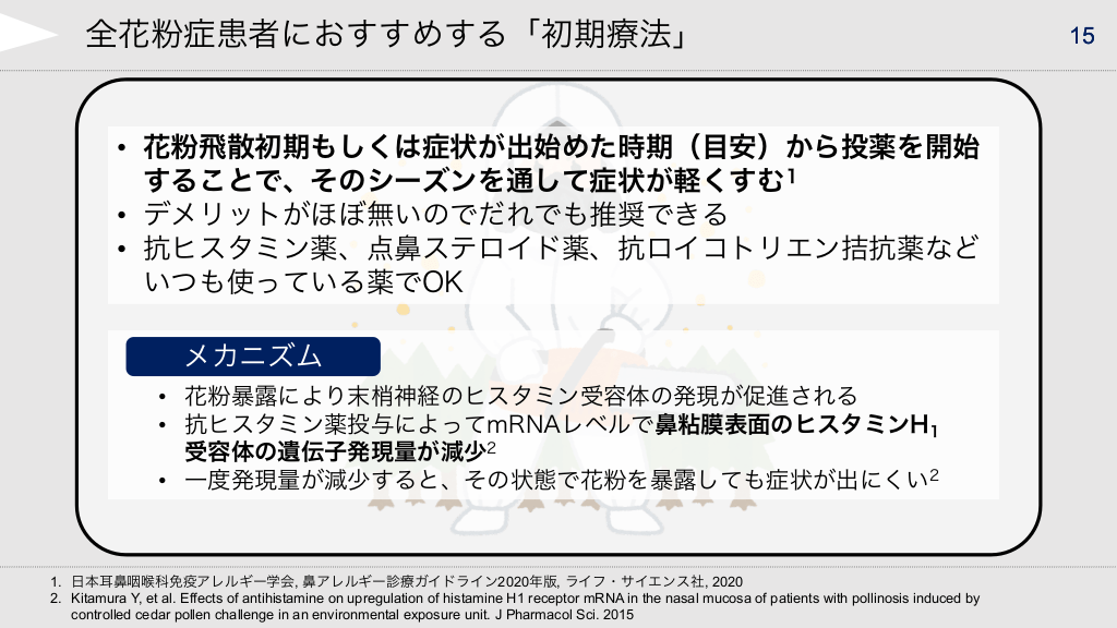 #15. 全花粉症患者におすすめする「初期療法」 • 花粉飛散初期もしくは症状が出始めた時期(目安)から投薬を開始 することで、そのシーズンを通して症状が軽くすむ1 • デメリットがほぼ無いのでだれでも推奨できる • 抗ヒスタミン薬、点鼻ステロイド薬、抗ロイコトリエン拮抗薬など いつも使っている薬でOK メカニズム • 花粉暴露により末梢神経のヒスタミン受容体の発現が促進される • 抗ヒスタミン薬投与によってmRNAレベルで鼻粘膜表面のヒスタミンH1 受容体の遺伝子発現量が減少2 • 一度発現量が減少すると、その状態で花粉を暴露しても症状が出にくい2 1. 日本耳鼻咽喉科免疫アレルギー学会, 鼻アレルギー診療ガイドライン2020年版, ライフ・サイエンス社, 2020 2. Kitamura Y, et al. Effects of antihistamine on upregulation of histamine H1 receptor mRNA in the nasal mucosa of patients with pollinosis induced by controlled cedar pollen challenge in an environmental exposure unit. J Pharmacol Sci. 2015 15