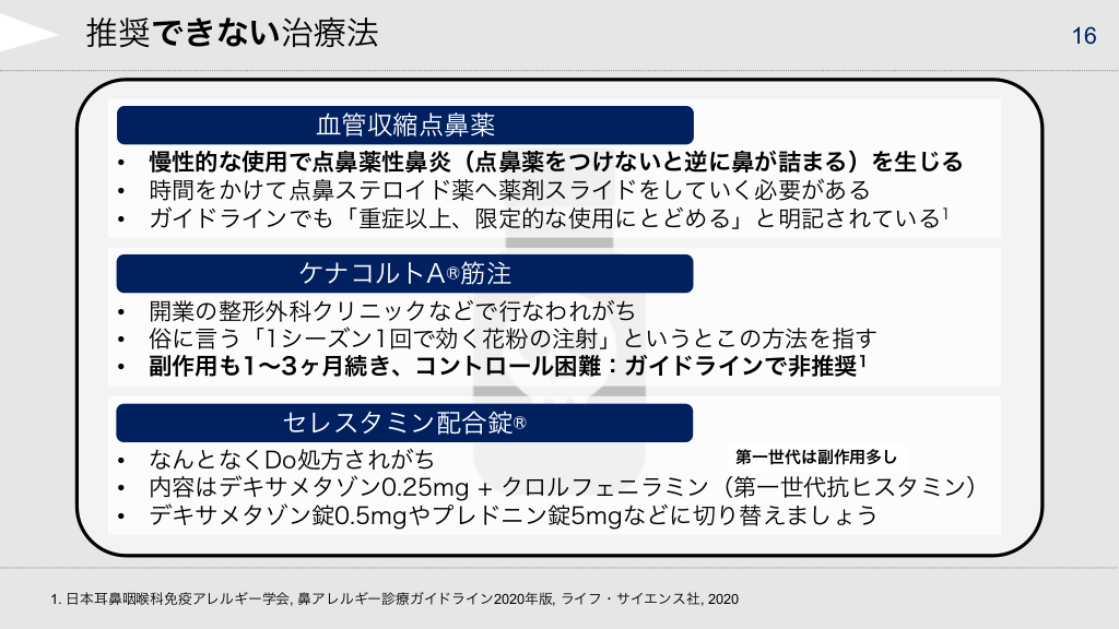 #16. 推奨できない治療法 血管収縮点鼻薬 • • • 慢性的な使用で点鼻薬性鼻炎(点鼻薬をつけないと逆に鼻が詰まる)を生じる 時間をかけて点鼻ステロイド薬へ薬剤スライドをしていく必要がある ガイドラインでも「重症以上、限定的な使用にとどめる」と明記されている1 ケナコルトA®筋注 • • • 開業の整形外科クリニックなどで行なわれがち 俗に言う「1シーズン1回で効く花粉の注射」というとこの方法を指す 副作用も1〜3ヶ月続き、コントロール困難:ガイドラインで非推奨1 セレスタミン配合錠® • • • 第一世代は副作用多し なんとなくDo処方されがち 内容はデキサメタゾン0.25mg + クロルフェニラミン(第一世代抗ヒスタミン) デキサメタゾン錠0.5mgやプレドニン錠5mgなどに切り替えましょう 1. 日本耳鼻咽喉科免疫アレルギー学会, 鼻アレルギー診療ガイドライン2020年版, ライフ・サイエンス社, 2020 16