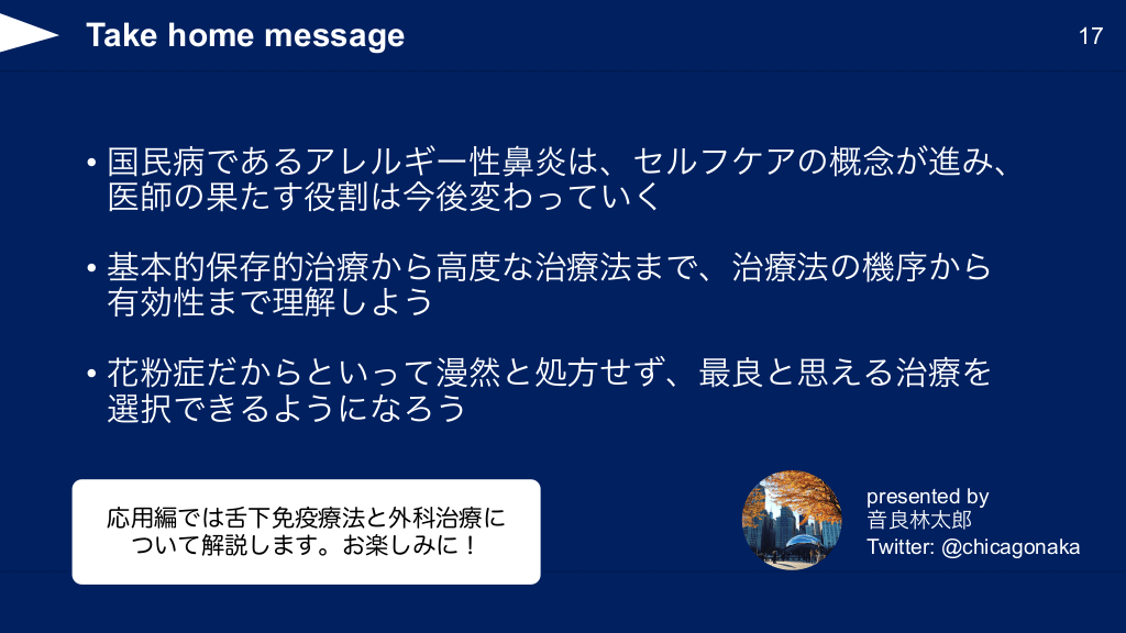 #17. Take home message 17 • 国民病であるアレルギー性鼻炎は、セルフケアの概念が進み、 医師の果たす役割は今後変わっていく • 基本的保存的治療から高度な治療法まで、治療法の機序から 有効性まで理解しよう • 花粉症だからといって漫然と処方せず、最良と思える治療を 選択できるようになろう 応用編では舌下免疫療法と外科治療に ついて解説します。お楽しみに! presented by 音良林太郎 Twitter: @chicagonaka